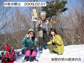 13.30に駐車場到着。登り出して尾根まで上ると、道の脇に、添え木をした桜の苗が植えてある。植えた人の名前が書いた札もある。大聖寺高校野球部とか、ソロプチミスト加賀とか、個人の物もあり、恋人募集中とか書いてある。去年の5月に植えたらしい。早く桜並木になると嬉しいね。観音堂の周りは、枯れた木が伐採されて広く感じる。北に鉄塔の林立している、小山が見える。あれが今度登る「熊坂妙高山」らしい。