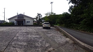 突き当り。白い建物の上に巨大に電波塔。駐車場広場。大分荒れた感じ。
