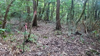 頂上展望無し。下草が刈ってあり歩きやすい。赤テープがあり辿ったら、すぐ林道に降りた。