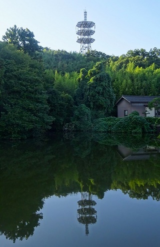 車を置いた三差路の近くの大きなため池。登って来た大きな電波塔。あのすぐ横にある「大山」。片道500mの、敬老の日の徘徊でした。