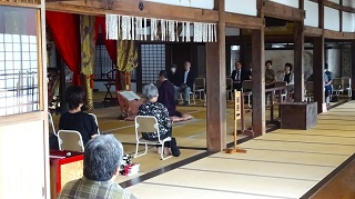 錦城山の近く、山ノ下寺院群の全昌寺に行く。近くの「ふれあい広場・古九谷の杜」の駐車場に車を置く。拝観窓口で未納の会費を支払い、本堂に上がる。読経が始まっていた。
