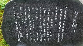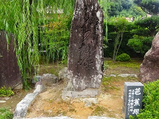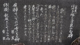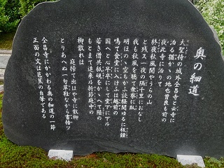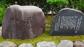 芭蕉忌における深田久弥の作全句の碑。日本百名山の著者深田久弥は大聖寺の人。俳句も作った。号は「九山」。「翁忌や 師をつぐ故に 師を模さず 九山」