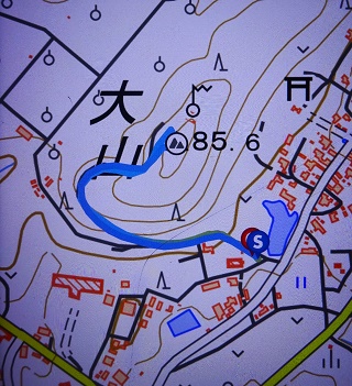 電波塔の反対側の藪の崖を5mほど登ると三角点がある。「4等三角点・点名は大山・標高は86m」。ここが大山の頂上である。