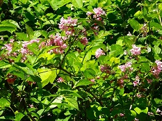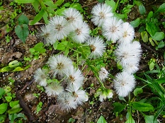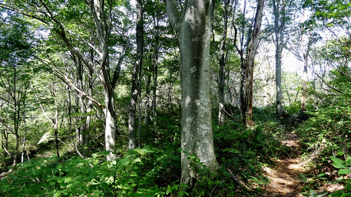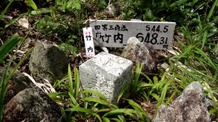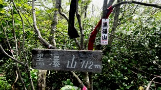 ![]() 靴を履き替えて、9.35分に出発。旧展望櫓を通って段々と国見平へ降りてゆく。今から行く黒瀑山は、三千坊より低い。登るのではなく降りてゆくのだ。9.50分に分岐に到着。ここは金山峠と云うらしい。右の堂辻という所から、左の梯子坂から三蛇ヶ滝に降りる道らしい。左に梯子坂の方へ進む。 なだらかな、地理院地図に国見平と云う記入のある部分を歩く。地図には登山路がはっきりと記入されていないので、良く判らない。ブナの林がある。 ![]() ![]() ![]() ![]() アキギリ ツルリンドウ モミジバハグマ ![]() 10.15分にまた分岐に出た。右に金山峠登山口、左に大池平と書いてある。この道は国見平を大きく回る遊歩道のようだ。 しばらく歩くと、道は三蛇ヶ滝の方へ、左の方へ降りてゆく。ここから三蛇ヶ滝へ降りる道は、案内板に依ると非常に危険だから初心者は通らぬようにと書いてある。その手前に右に尾根が続いている。ここから黒瀑山の方へ入り込む。登山路が無いので標識も無し。しかしはっきりとした獣道が続いている。尾根は木が生えているが結構細い尾根だ。木が生えて居なかったら怖いかも。 ![]() ![]() ![]() ママコナ ホツツジ 食べられないコケ 右手に南砺市の平野が見える所がある。 ![]() ![]() 幾つも小さな瘤を過ぎて、広い台形の中に切り開きがあり、「黒瀑山」の標識を見付けた。標識の裏に「金沢三角会」と書いてある。金沢三角会は、三角点を探しに行くと赤い布に三角会と書いたものを良く見かける。10.55分。 ![]() しかしこの山には三角点が無い。この先の斜面を降って行くと大分離れた所に三角点マークがあるが、踏み跡はここまでで、この先道はないようだ。記念撮影。しばらくいて元の道を戻る。 ![]() ![]() ![]() ツリフネソウ キツリフネソウ オトコエシ これから、国見ヒュッテの先より伸びた尾根の、その先に有る三角点を探しに行く予定。地図には三角点まで実線が記入されているので、道は確実に在る筈である。11.35分、分岐より外回りで広い遊歩道で林道に出る予定。高低差が無く広い遊歩道を行く。 ![]() 12.00時に舗装した林道に出る。ここは堂辻と云う地点らしい。少し上へ登って行くのが細い旧道で、下の広い道が遊歩道。この遊歩道を降りて来た。先で合流するが、距離は遊歩道が2倍ほど長いようだ。 ![]() ![]() ![]() 「バアソブ」がぶらぶらと咲いている。まだつぼみのもある。 堂辻付近に道の広い所があり、ここに車を置いて山に入る人も居るようだ。一台泊まっている。 ![]() 12.15分に「医王権現」に着いた。道の反対側にトイレがある。 医王権現社の前は「国見公園」になっていた。片隅に展望台がある。道宗道の山々だろう。 ![]() 福光辺りだろう。手前左の丸いピークが、これから行く三角点のあるピークと思われる。 ![]() ![]() 12.20分。公園の少し先に「国見ヒュッテ」があった。管理人が駐在しているようだ。案内板を見ていたら「医王山県立自然公園 ふるさと歩道」と書いてある。医王山は石川県の山だと思っていたが、ここは富山県の公園だった。案内板にはこれから三角点を探しに行くピークに「岩崩山」と書いてある。この山には岩崩山と云う山名があったのだ。 ![]() 案内板を眺めていて、近くにいた登山者にいろいろ聞いた。三角点を探しに行くと云ったら、その人も三角点好きらしく、色々と教えてくれた。林道を遠回りしなくても、直ぐ横のコテージみたいな建物の横を降りて行けば、近道と聞く。 ![]() 坂を降り切ると祖谷下山口の道標がある。南砺市祖谷町へ出るようだ。舗装路を少し進むとキャンプ場に出る。キャンプ場は今は閉鎖しているようだ。 ![]() そのまま舗装路を進むとキャンプ場を横切り、林道になり、岩崩山に続いている。突き当りが頂上で変わった屋根のあずまやがあった。12.40分。 あずま屋でお湯を沸かしてもらって食事。あずま屋のすぐ横の高みに三角点が在る。 ![]() ![]()