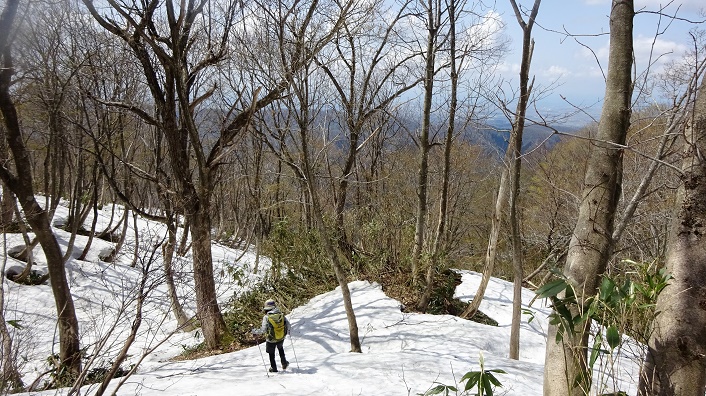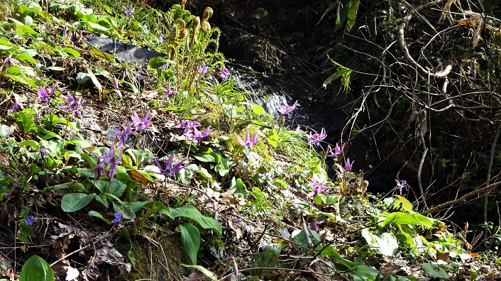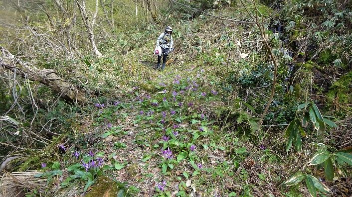 2021年04月15日(木)7回 40鉄塔-「入道山」-43鉄塔 ![]() 介添え人のS女史と「入道山」へ。いつもの手取川第三ダムの駐車場より出発。今日は時計回りに40番鉄塔から登る予定。 ![]() 駐車場のすぐ後ろに林道入口がある。少し登るとダム湖が見える。堰堤の上を通って来た。 キケマン ネコノメソウ エンレイソウ ![]() ![]() ![]() ![]() 林道に崖崩れ、横を通る。そのすぐ先に鉄塔巡視路の登り口がある。 ![]() 北陸幹線40番鉄塔の標識を入る。 ![]() こちら側から登るのは2度目。沢の中だがプラ階段があるから間違いない。 ![]() しばらくで左の細尾根に取り付くのだが、取り付きを見逃してまっすぐに沢を登ってしまった。 ![]() 沢が急になり登れなくなって初めて道間違いに気付く。手袋は水濡れ靴の中にも水か入った。貴重な沢登りを経験して、左の斜面を木の枝に掴まりよじ登ったら、すぐ尾根に道に出た。老人はどっと疲れが出た感じ。おーっ山は新緑になっているぞ。 カタクリの咲く細尾根を登って居たら、白いカタクリを見付けた。一輪のみ。何度も通っているがここで白いカタクリは初めてだ。 ![]() 4年連続の4月登山 エンゴサク ![]() ![]() ![]() ![]() 細尾根が済むと右に杉林の中をトラパース。 ![]() 送電線鉄塔40番のすぐ上に着く。 ![]() ![]() 方向を替えて、次の41番鉄塔までまっすぐに登って行く。鉄塔間の下の木が切られた。昔は杉林があった。 キクザキイチゲ 41番鉄塔は展望があり気持ちが良い。 ![]() 海が見える。四角い建物は高速の金沢近くの、ジャパンディスプレイの建物らしい。鉄塔は登山口林道の反対側の鉄塔らしい。 ![]() ![]() 鉄塔より更に登ると尾根の上より降りとなる。ツバキの木が多い道である。 ![]() 少し降ると「入道山反射板」への分岐がある。 ![]() 少し登って平坦になった登山道に座り込んで昼食。頂上で昼食予定が、老人はへたばって、ここで早くも13時だ。昼食後荷物を残して頂上往復に出発。 ![]() 残雪が出てきた。高い笹が倒れ込んだトンネルをくぐり、池へ落ちないように通過。 ![]() いつもこの辺りに残雪がある。頂上裏側から登る。 ![]() 一番高い地点に三角点がある。