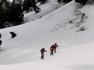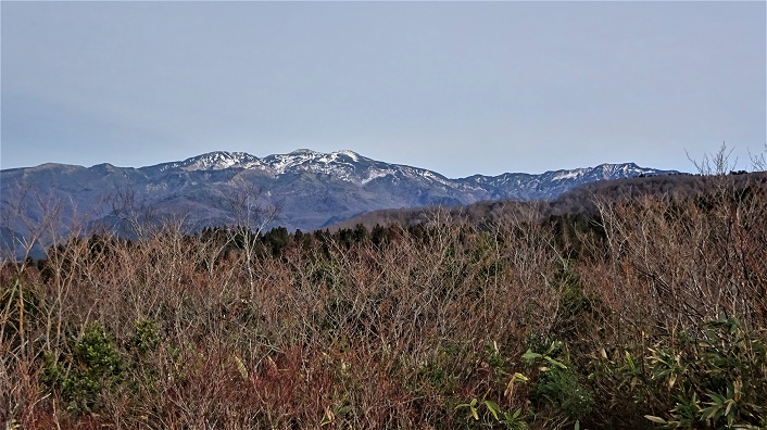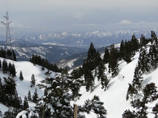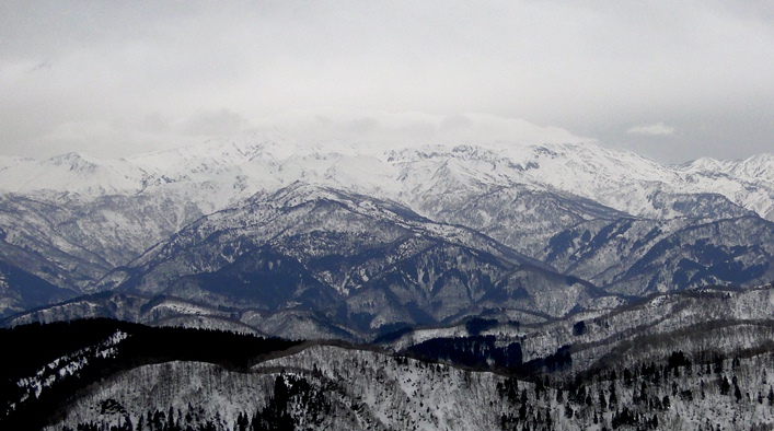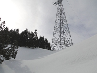白山が近いのだが、木が茂っていて思ったほど見えない。ようやく伸び上って「白山」を撮る。頂上に雲が掛かっていた。 ![]() 木の間から「別山」と「三ノ峰」が見える。 ![]() 護摩堂峠より「取立山」方面。さらに「大長山」かな。 ![]() ![]() 二つある反射板の間の、日陰で昼食。「アカモノ」がいっぱい咲いている。 去年鉄塔に「山名札」を提げたのを思い出した。探したら鉄塔の上の方に札があった。外してきて来て三角点と撮影。また鉄塔へ札を戻して懸けた。 ![]() ![]() ![]() 藪漕ぎを考えると嫌なので、降りは護摩堂峠に降り、林道を歩いて帰る事にした。 ![]() ![]() 12.10分下山開始。登山路はハッキリとしている。12.25分に峠を横断している林道に降り立つ。首なしの地蔵様が置いてある。地蔵横の赤いテープが登山口の目印。標識無し。 ![]() 林道を横断して向かいの尾根に、登山路が続いて登っている。地図を見ると、取立山の避難小屋まで続いているようだ。 林道を右に降りてゆく。 ![]() さらに分岐を、戻るようにして山裾の林道を歩き出す。 勝山市が見える。ドームは恐竜博物館だろう。 ![]() 前方の稜線の上に反射板が見えた。あそこが護摩堂山の頂上らしい。 ![]() さっきまで昼食をしていた反射板。 ![]() ![]() 林道をぶらぶらと降りる。少し遠回りだが、藪漕ぎを考えると気持ちは楽だ。前方は、今年登った「大日山」らしい。 ![]() ブルが置いてある杉林にくると、峠の大杉は近い。13.20分。 ![]() 13.55分に国道まで下りて来て、林道入口に「入山禁止」の立札を見付けた。登った時は近道をして林道に出たので、この立て札に気が付かなかった。「市有林保護規定により、資源保護の為入山禁止」と書いてある。我々みたいな三角点探訪の為の入山も禁止されるのか。とりあえず登りの時は気が付きませんでした。山の中では誰一人とも遇いませんでした。 ![]() トンネル出口に車を置き、林道を一番上の鉄塔まで登る。「峠の大杉」の先辺りより尾根道に入る。道不明。半分以上登り、緩やかになってくると、登山路がはっきりとしてくる。降りは護摩堂峠まで降り、林道を歩いて降りた。 ●次項2014年・第47回登山は、6/18「火燈山・火燈古道」へ● 2013年03月17日(日)7回 谷峠トンネル「護摩堂山」往復 今回で3回目の「護摩堂山」である。いつも今頃の時期である。私にとって雪山気分を味わえる楽しみな山である。今日は4人。N氏とH女史とS女史を、瀬女道の駅で載せて白峰より谷峠トンネルを抜ける。 ![]() トンネルを抜けた左側に、いつも除雪した場所がある。車が2台留まり3人が出発準備中。8.30分、我々もあとに続く。快晴。雪が締ってカンジキ無しでも歩ける。 ![]() いつもの通り林道を歩く。結構雪が残っている。谷峠の最上鉄塔に着くと白山の方が見えてくる。白山が見えて心が躍るが、護摩堂山頂上の陰になり、大汝峰位まで見える。 尾根まで登ると、後は尾根伝いに登って行く。雪のある時しか登っていないので、夏道があるのか知らない。雪の上の道もいつも他人の足跡任せ。毎年少し違うような気がする。右手の西の方に格好の良い山が見える。どこか?どこか?と考えながら登っていた。家へ帰ってから色々調べたら、左が「銀杏峰」で右が「部子山」だと思う。たぶん間違いない。 ![]() 2時間10分かかって、10.40分に頂上到着。と云うよりはようやく追いついた。過去2回は寒かったが今日は全然寒くない。東の白山と別山と三ノ峰方面。 ![]() 南の方は、左奥が「大長山」で右手前が「取立山」。間の谷が護摩堂峠だろう。先着に若い二人がいる。 ![]() 「白山」。去年登った「釈迦岳」を探すが、いつも目立たないので残念。 ![]() 「別山」は、とても格好よく聳えている。続く「三ノ峰」も格好良い。 ![]() 「御前峰」と「大汝峰」の間に、「剣ヶ峰」が顔を出している。 ![]() ![]() 大きな反射板が二つある。三角点が在る筈だが、いつも雪の中でどこら辺にあるか判らない。山名札を反射板に提げておいた。 ![]() 本日の我々パーティ。4名。 1時間10分程、山を眺めて食事をして、小松の最高峰「大日山」を眺めながら、11.50分に下山開始。ちょっと早くてもったいない。13.35分に早くも車に到着。 2012年03月22日(木)6回 谷峠トンネル出口より「護摩堂山」往復 ![]() 四日前「西山」に登った時、この「護摩堂山」が目の前に見えた。鉄塔に続く稜線は真っ白で、あそこを今年も歩こうと、その時決めた。朝8.30分、なかうみの里でS女史とN女史を乗せて、白峰町を通り谷トンネルを抜けて福井県に入り、トンネルを出た所の左の広場に車を置く。いつもここは除雪してある。9.20分カンジキを持って目の前の雪の壁をよじ登る。 ![]() 林道を歩き出す。雪は締っていて歩きやすい。10.00時に一つ目の鉄塔の下を通る。10.15分に二つ目の鉄塔の下に着く。この稜線を右に折れて林道を少し進んで、林道より離れて稜線を登って行く。足跡に従って稜線に入ったが、右側からまた林道が合流してきた。林道は稜線より下の