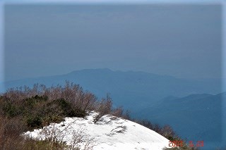 三角点から下は雪渓である。その向こうに大獅子山から猿ガ山。その上に微かに北アルプスの剣、立山、薬師と見える。双眼鏡で見ると右に槍・穂高と見える。さらに離れて乗鞍岳。さらに離れて木曾御岳。お天気が良すぎて霞んでいるが充分に満足満足。