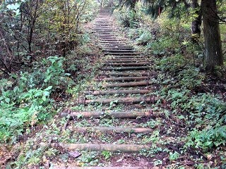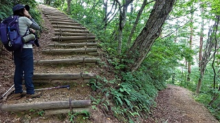 道は広く整備されていて歩きやすい。始は少し下るように登山路は始まる。登り坂が急になると長い階段になる。階段は4ヶ所くらいある。