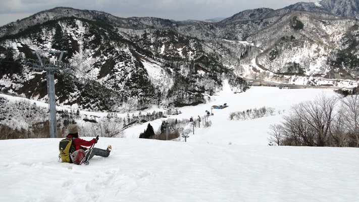山の方は大日山、鈴ヶ岳がよく見え、白山の方は雲が掛かって頂上は見えないが、前衛の山並みが見渡せる。目の下に大日スキー場のゲレンデが広がる。獅子吼や倉ヶ嶽も見える。20分くらい休憩、お菓子を食べ下山し始める。今日は弁当を持ってこなかった。