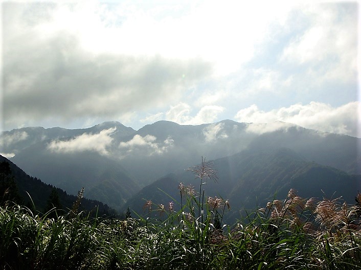 ![]() 手前の黒い山が尾根続きの「白山伏拝」のピークで、その上の山が「大長山」でその上辺りが白山なのだが、今日は雲の中。 ![]() 頂上に「リンドウ」が咲いている。秋なのだ。 ![]() 伏拝から経ヶ岳に続く稜線の上の山は「赤兎山」その上は「三ノ峰」だと思う。赤兎山の麓に見える剥げた所は、望遠鏡で見ると登山口の駐車場らしい、 ![]() 昼食には少し早いので、頂上に荷物を残して、「白山伏拝」まで往復することにする。一度下りスキーゲレンデの最上部を通りほぼ平坦な道を20分ほどで到着、ここは法恩寺山と同じくらいの標高だ。11.40.標識とベンチあり。 「白山伏拝・1360m」の標識がある。ここは白山を拝んだ場所らしい。残念ながら今日は白山は拝めない。右に折れて登山路が「経ヶ岳」に続いている。また直進して小原林道に直接下りる道らしき痕跡がある。これが昔の禅定道かも知れない。 ![]() ![]() 12.15.法恩寺頂上に戻り着き昼食にする。「ナナカマド」の実が赤い。朝は小雨が降りそうな感じだったが、段々晴れてきた。13.25分、1時間以上も長居して下山に掛かる。 下りはスキーゲレンデの方が眺めが良いだろうと、ゲレンデを降りる。大野の平野が望める。ゲレンデの藪がひどくなりようやく元の登山路に戻る。 ![]() ![]() 14.10分.駐車場到着。車を中ノ小屋に横付けして、蛇口の水で身体を拭き、着替えて、ベンチで抹茶を頂き帰路に着く。 帰りは谷峠を経由して帰る。 2008年09月02日(火)初登山 平泉寺-「三頭山」-中ノ平 ![]() 相棒K君のお勧め、「法恩寺山」へ連れて行ってもらうことにした。我々が愛する「白山」の、「越前禅定道」の始まり地点である。 立札に拠れば「白山へは、平泉寺(福井県)、白山比咩神社(石川県)、長滝寺(岐阜県)を各々起点とする三筋の登拝道(白山禅定道)がのびていました。特に平泉寺からの道は、泰澄が開いた重要なルートとされていました。この白山禅定道は「歴史の道百選」に選定されました」 調べてみると法恩寺山は結構標高が高い。下から歩くと標高差が1000mを越える。私の体力では無理だと思ったら、相棒は勝山のスキー場から林道で、頂上まで1時間ちょっとで登れる地点まで車で入れるという。そこまで車を一台入れておけば、帰りは楽チンである。福井県の山であるが、加賀県境より九頭竜川までは、加賀の山に入れている。 7.40.瀬女の道の駅で待ち合わせ。白峰から谷峠を越えて、勝山の手前、長い暮見トンネルを抜けた所に信号があり、左に有料道路・法恩寺山道路に入る。そのまま上ると料金が要るので、平行している林道に入る。林道は細くて遠回りになるようだが、舗装してありほとんど通行が無いので、時間的にはあまり変わらない。有料道路からの道と合流してしばらく上ると、左に林道が分岐して法恩寺山の立札がある。直進すれば林道は峠を越え六呂師のスキー場から大野へ出るらしい。左に法恩寺山の方へ入ると、中ノ平避難小屋を通り、突き当りの駐車場に着く。8.50.ここに車を一台置く。また戻るのだが今度は有料道路を降りる。スキージャム勝山を通る。大きなホテルがある。途中に料金所があるが登りに徴収され、下りは無料である。![]() 国道まで戻り勝山市内で左折して大野方面に向かい途中平泉寺の案内に従い左折する。9.30分.平泉寺前の大きな無料駐車場に車を置く。歩き出すとすぐ泰澄大師廟があり参拝。平泉寺は神仏分離令により今は白山神社になっている。苔むした石段を登る。 ![]() 途中左に「御手洗池」があった。立札に拠れば「泰澄大師は養老元年(717)、白山登拝の途中、この林泉で白山大神が出現、当地に社を建てて白山の神を奉斎された。」とある。さらに登り拝殿、本殿を拝み、さらに右の参道を登ってゆくと三ノ宮に着く。ここから登山路になる。 ![]() 三ノ宮の後ろで道は二つに分かれている。左は新道で谷道の一般路らしいが、最近の雨のためか入れないようになっている。右は尾根道で白山禅定道と書いてある。途中「剣乃宮」の祠を通る。 ![]() 「ホトトギス」の花を見つけた。 ![]() 11.10.新道が合流してくる。11.35.三叉路に到着。立札があり「右・法恩寺山。左・大師山」。大師山の方へ50mほど戻ると、「三頭山」頂上に出る。ベンチがあり頂上の標識がある。三角点がある、777.5mだ。ベンチでお湯を沸かして昼食にする。少し木が刈ってあり、スキージャムのホテルが見える。勝山方面の平野も望める。 ![]()