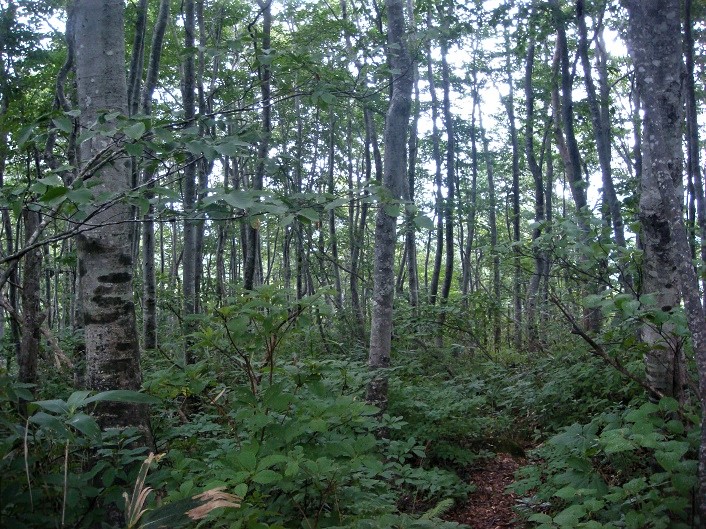 さてここから先は歩く人がいないのか、急に藪が凄くなる。 道は完全に見えない。両手で笹を分けたり、足で登山路を探り当てる。先ほどの雨で笹が濡れており全身ずぶ濡れ状態。おまけに虫が凄い。顔の周りを飛び回り、目に飛び込むは鼻に飛び込むは。斜面では笹を押しのけて進むと、その反動で押し返されて斜面を滑り落ちそうになる。 ![]() ![]() 「ミヤマコゴメグサ」というらしい。ほとんどが笹原だ。登山路はあるのだが完全に埋もれている。泳いだり潜ったりして笹原の海を進む。 ![]() 「イワショウブ」が咲いていた。 ![]() 14.30分.経ヶ岳より一時間掛かって北岳に到着。法恩寺山と赤兎山方面に登山路が分岐している。赤兎210分と書いてある。四時間近く掛かるのか。おまけに道は悪そうだ。10分休憩。 ![]() 相棒は昨年、法恩寺山からここまで辿り着いている。だから少しは道が良くなるのかと期待していたが、藪漕ぎは全然変わらない。下手をすると前を歩いている人が見えなくなる。 ![]() 「サラシナショウマ」が咲いていた。小さいピークをいくつも越えて、藪漕ぎが延々と続く。登山路はある。ただ鎌が入っていなくて笹で覆われている。尾根を歩くので道はなんとか判る。 一時間半も歩いたらブナ林に入り、笹が少なくなって登山路が現れるようになった。ようやく座り込める地面があった。私はへたばって座り込んで一休み。二人に先へ行ってもらう。 ![]() ![]() ![]() 経ヶ岳より北岳経由で悪戦苦闘、藪漕ぎの連続で、3時間以上掛かって、16.35に見覚えのある「白山伏拝」の頂上に到着。標識とベンチがある。足が遅くて遅れた私を、コーヒーを沸かして待ってくれていた。「大冒険だったネ」とS女史が言った。しかし車までまだ1時間半は掛かりそうだ。17.05.出発。 法恩寺頂上に向かって進む。太陽がだいぶ西に傾いてきた。 ![]() ![]() 17.30.「法恩寺山」の頂上到着。 さっきまで居た「白山伏拝」が黒く見える。その上の山は大長山あたり。その上にかすかに白山の稜線が見えてきた。 ![]() ![]() 18.00、朝置いた中ノ平の駐車場に辿り着く。18.15.中ノ平避難小屋の水場で一休み。ここから登山口の展望広場に置いた車を取りに行く。18.50.朝登り出した展望広場の駐車場に到着。もう真っ暗で車は一台もない。展望台から下界の明かりが宝石のように見える。着替えて林道を大野市の方へ降りる。 最後にもうひとつの難関に出会う。なんと林道の終点近くでバリケードがしてある。降りてみると猪除けの電線が道を横断している。それに引っかからないようバリケードがしてあった。長い林道を戻るのも大変。村も遠そうだ。よくよく観察したら、横切っている電線は切れないように、ばねで伸縮する様になっていた。バリケードをどかし、電線を両側で踏んで車を通しようやく脱出。バリケードを元に戻して帰った。家に着いたら夜の9時になっていた。相棒の奥さんから携帯に安否を尋ねる伝言があって恐縮。17.05.伏拝を出発。17.30.法恩寺山。18.20.中ノ平駐車場。18.50.展望広場駐車場。自宅21.00でした。 後日談。山でS女史に目が赤いよと言われた。虫が目に入って擦ったからだろうと気にも留めなかった。痛くもなかった。所が翌朝右目が腫れ上がって目が塞がってしまっていた。目は痛くないが腫れ上がって痒い。心当たりの目医者に電話をかけたが日曜でお休み。仕方がないから小松市民病院の救急外来に見てもらった。麻酔科の先生が目薬をくれて、明日正式に眼科で見てもらえと言われた。月曜に眼科へ行ったら虫に刺されたのでしょう、と薬をくれて、直らなかったら又来てくださいと言われた。家の中でもサングラスをして、車に乗るときは細く開く目でなんとか運転。4日ほどで元に戻った。 2008年09月13日(土)2回 中ノ平-「頂上」-「白山伏拝」 ![]() 前回は平泉寺から中ノ平避難小屋まで登り、雨のため頂上を断念した為、今回はその続きで中ノ平避難小屋より、「法恩寺山」の頂上を目指す。 ![]() 7.50.相棒K君を乗せて、小松の自宅を出発。高速道に乗り丸岡インターで降りる。九頭龍川に沿って遡る。白峰から山越えコースより大幅に時間が短縮されるかと思ったが、大して違わないようだ。前回と同じく暮見より有料道路を通らずに林道に入る。スキー場を越えた先の、この立札を左に入る。「法恩寺山登山道」、支柱に「山小屋・森林パーク」と書いてある。直進する林道は峠を越えて大野の方へ下って行くようだ。 ![]() 避難小屋を過ぎて、9.50分.林道突き当たりの駐車場に車を置く。 10.30.登山路がスキーゲレンデに接する地点に出る。ゲレンデに出ると、展望が良い。スキー場が見下ろせる。ダムも見える。その向うの山は浄法寺山、丈競山辺りか。右には大日山、鈴ヶ岳が見える。 ![]() 10.55.法音寺跡に着く。白山登拝の為の宿泊・休憩の建物あったと立札に書いてある。今は祠とベンチのみ。泰澄が養老元年白山登拝の時、ここで法華経(法)を読誦(音)する老翁に会ったというのが名前の由来と