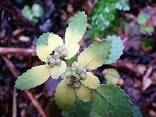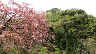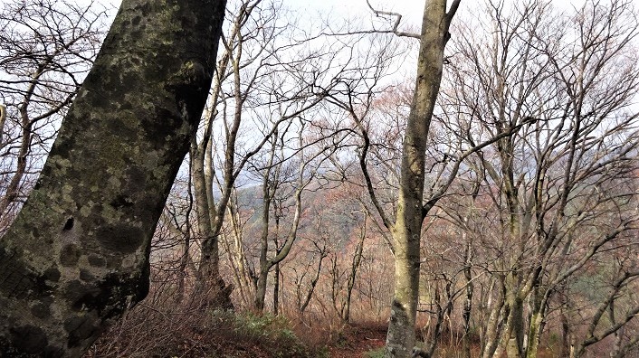 三角点を過ぎた先に、石廟があり、中に石仏が三体並んでいる。欠けているのもある。山名の札が二つほど置いてある。全員で記念撮影。 ![]() ![]() 此処からの眺めは最高である。坂井平野の向こうの海岸線に、白いガスタンクが並んでいる。 ![]() その右には、北潟湖が見え、鹿島の森が丸く見える。先日登った、熊坂妙高山も判別できるようになった。東の方は福井の山が連なるが、少しガスが掛かって見難い。手前の大きな山は、富士写ヶ岳だ。 ![]() ![]() この写真は、水坪山の方から見た「剱ヶ岳」である。平野に聳えているのが良く判る。 さて今日はこれから、水坪山まで往復する。 11.30.剣ヶ岳より「水坪山」を目指す。前回断念したので、ここから初めての道だ。頂上から一寸戻った所に分岐がある。ブナの林の間から、目指す水坪山頂上が見える。その下を林道が走っているのが見える。急坂を降りる。結構長い下りだ。 ![]() ![]() 鞍部まで降りたら、また登りになる。尾根が細くなる。両側が落ち込んでいる。前回藪がひどくて断念したが、今の時期は道が良く見える。階段も付いている。降りてきた剣ヶ岳を背に、また登る。 ![]() 前方に富士写ヶ岳が見える。その右は火燈山と小倉谷山だろう。まだ雪がいっぱいだ。尾根が細くて鉄柱を立て、鎖が張ってあるところが多い。新しいから最近整備したのかも知れない。 大きいピークが二つほど、小さいピークが三つほどで、新しく出来た林道にたどり着いた。12.10分丁度、刈安山から延びてきた林道が、ここで終点になっている。バラスが入っており出来上がったばかりの様だ。車が方向転換できるよう、広くなっている。 ![]() ![]() この林道からの眺めがすこぶる良い。さっきまで居た剣ヶ岳の向うに、平野が広がり海岸線まで見える。まだ進入禁止なのだろう、車が入ってこないので、道路に陣取って食事とする。 ![]() 食事を済ませて、荷物をここにおいて、水坪山の頂上を往復する事に決定。剣ヶ岳から水坪山を通り刈安山に続く登山路は、林道を30mほど右に進んだ所に、斜面に新しい階段を作って続いている。登ってゆくと崖で途絶えた登山路に合流している。しばらく縦走すると、水坪山の頂上を左にまいて、登山路は段々下がってゆく。この稜線は、石川県と福井県の県境になる。覗くと石川県側が見える。山中温泉らしい。鞍掛山も見える。 ![]() 頂上へ登る道は無いようだ。それでも登る人が居る様で、けもの道が続いている。一番高い所に到着。赤い布が一つ下がっているが、山名表示が無い。 ![]() 13.10.頂上といっても笹の中で、見通しは無し。これから木が茂ってくると、登ってこれなくなるかも知れない ここに、我々の山名札を提げる。 富士写ヶ岳に別れを告げて、元来た道を下る。此処から見る富士写ヶ岳は、どっしりと横に大きくて、あまり富士に似ていない。どうもイメージが違う。 ![]() 14.10.剣ヶ岳まで戻り、ブナの林を下山する。 ![]() ![]() 杉林の中に、「ネコノメソウ」が咲いている。名前は合っているかな。 ![]() 清滝ダム湖の、反対側を通って、少し遠回りをして帰る。「イチリンソウ」が咲いていたと、S女史が画像を送ってきたが、私はぬかるみに気を取られて、気付かず通り過ぎた。春は近い。嬉しい。 15.25.車に到着。朝待ち合わせた「ゆめのゆ」の温泉に入って帰る。 2008年09月10日(水)2回 清滝-「剣ヶ岳」往復-車で「刈安山」 ![]() 「加賀の里山逍遥」の掲載山数を100山にしようと、いろいろ調べていたら「剱ヶ岳」を見付けた。この山は福井県の山であるが、峰続きの「水坪山」は石川県との県境の山である。釼ヶ岳は加賀の山に入れた。 ![]() 小松の自宅を朝8.00に出て国道8号線を走り、金津インターを過ぎ、信号機のある「中川交差点」を左折。8.50分、道が2つに分かれている所にこの看板がある。以前ここから刈安山に登っている。ここから清滝ダムのほうへ入る。高速道路の下を通り清滝の村に入る。ここで道に迷ってウロウロした。村の真ん中の十字路を、直進すればよかった。右折が広い道であるが、直進の細い道をはいる。あとは山に向かって一直線。 ![]() 9.10.砂防のダムに着いた。車が一台止まっていた。林道はまだ続いていたが、道が悪そうなんでここに車を置く。向うに見えるのが剣ヶ岳らしい。 ![]() 先着の車は登山者かと思ったら釣り人だった。湖面にゴムボートを浮かめて釣りをしている。湖周の林道を歩くと、湖の終わった所に駐車場みたいなものが造ってある。しかし荒れた感じだ。ダムに注ぐ川に沿って林道を歩く。 ![]() 9.40.林道の終点。崖の下が広い空き地になっている。もう少し林道を整備してくれれば、ここまで車は楽に入れる。林道の終点より登山路になる。ここに、この山で見たたった一つの標識がある。「剣ヶ岳」と書いてある。これが無ければ、初めての山の一人歩きは心細いものになる。 ![]() 10.15.尾根の上まで登りつく。木の間から車を置いた清滝ダムが見える。ここからは尾根歩き