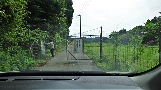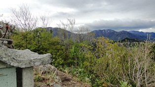 ![]() 下山開始。同じ道を降りる。 ![]() 釣り人は帰ったようだ。 ![]() 柵を開けて清滝町へ出る。今度は車で「刈安山」に上がる。舗装道路が上まで続くが、くねくねと曲りなかなか遠い。 ![]() 県境の峠の広場に登り着き、そのまま「刈安白山神社」大鳥居をくぐり、展望台のある頂上に上る。展望台の下の駐車場に車を置く。駐車場の裏が「刈安白山神社」である。ここにも「三角点がある。