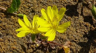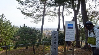 2025年10月01日(水)8回 「あじち山」-「五軒丁山」 雨の予報が晴れてきた。ちょっとだけ「あじち山-五軒丁山」を徘徊。 しおさいロードに架かる歩道橋の、下を通り抜けてすぐ右に入ると「八田農村公園おにゆりの里」駐車場がある。トイレもある。12.20分。登り口が見える。 階段を登り、分岐を海の方へ進むと、木材を組み合わせた塀がある。この塀の裏に10メートル程入ると三角点。 「3等三角点・点名は八田・標高は18m」。ここが「あじち山の頂上。5分で登頂成功。 素敵な山札あり。 この柵の裏側に、山札と三角点。ぼさっと歩いていると見逃す。 柵に沿って進み歩道橋を渡る。 昔あずま屋があった地点より、海岸に降りる。 浜辺に ハマニガナ? 自転車と歩道の専用道路を歩く。 前方に「五軒丁山」が見えてくる。倉部川の橋を渡る。 すぐ、五軒丁山に入る道。 竹松海岸はまなす群生地。 その先の高台に「4等三角点・点名は村井・標高は20m」がある。ここが「五軒丁山」の頂上。13.20分。横に座って昼食。30分以上も座って、ぼさっ-と。 海からの涼しい風。白山は見えず。 下山開始。 県庁が見える。 同じ道を戻る。向こうの林があじち山。 はまなすが一輪だけ残る。 戻る。 ハマゴウ。 自転車歩道よりの帰り道。 トベラ。 あじち山の高い地点に「白山ビュースポット」がある。いつ登って白山が見えないビュースポット。すぐ下が駐車場。14.40分。2時間20分の老人徘徊でした。 ■次回登山は、10/4「鳥越城山」へ■ 2025年03月13日(木)7回 「根上り山」と「高松公園」 一月に歩いて居るが今回はS女史を案内、ついでに「高坂公園」も周った。 小松インターの前を走り抜け、一直線に能美市に入るとすぐ左に「根上り山」の案内板がある。前回と同じ根上まちの駐車場。今日も一台も止まっていない。 10.20分。 根上町の由来の「根上り松」が残っている公園。 広い道を進む。 桜の木が植えてある広場の下。管理室がある。前回三角点からここに出たので、今日はここから三角点往復。 三角点近くまで道があるような感じ。 つばきの花が落ちている。ヤマツプ地図を見ていて少し藪を漕ぐとすぐ三角点。 崖の上に三角点。「4等三角点・点名は根上・標高は13m」今日は黄砂で山は見えず。10.40分。 崖の下に民家、住民が見える。変な目で見られそう。そっと戻る。 管理室の横のシイタケ栽培の原木。 遊歩道を登る。 広場に桜が植えてある。 根上稲荷神社にお参り。 桜は、高坂町根上町の小中生が植えたらしい。 一番高い所の「白山遥拝所跡」に登る。黄砂で白山は見えず。11時。 室町時代の「義経記」という本に、ここが出てくるらしい。 遥拝所跡にある墓石の由来版。降りて「根上り松」の方へ。 黒松500本植樹と書いてある。色々整備有難うございます。 「源平盛衰記」に、ここで戦があったと書いてある由。 「根上り松」に出た。 町名にゆかりの「根上り松」 軍記物に出てくる「根上り松」の後継松らしい。名前の由来を繋ぐ為に護られている。 通り過ぎて山を降りる。 車を置いた場所とは違う駐車場に降りる。 町の外側に出て「高坂公園」に向かう。 我が家にも咲くリュウキンカ。 信号を渡って「高坂公園」に入る。 藤棚を通り、運動広場越えたらトイレがあり、「あずま屋」も在った。あずま屋を占領して昼食。ほとんど人は見掛ず。12時。 公園の裏側に出る。赤い太鼓橋があった。 太鼓橋を渡り公園を出て、町の反対側に出て戻り始める。 高坂公園案内板。 イモカタバミ。 交差点を越えたら「高坂地蔵堂」が在った。 一回りして駐車場まで戻ってきた。13時。車に乗って「弁慶謝罪の地」の銅像を見に行く。 去年の11/14の誕生日登山に、安宅からこの近くまで来たが見逃していた。道林寺跡に在った。 安宅の関で、義経を金剛杖で叩いたのを、ここ迄離れて謝罪した。 うろ覚えで前回探せなかったが、根上り山の近くだった。 S女史としの待ち合わせ場所、小松市民病院近くの「末広園地」も歩きたいと云うので寄る。 末広園地の日本庭園。 あずま屋。 運動広場。 白山は今日は見えず。白山はビュースポットの案内板も、汚れて見えず。 ■次回登山は、3/15「阿稜山」へ■ 2025年01月11日(土)6回 「根上り山」一周 「根上り松」のある事は知っていた、能美市根上町の町名の由来の「根上り松」があるらしい。近くを時々車で通る。入った事が無いがこの間友達の話題に出た。寒波が来てしばらく歩けなかったが、今日は明るい。何も持たずに歩いて来ようと、小松インターの前を通り、まっすぐ進むと能美市に入る。左側に案内板があった。 入ると大きな駐車場があった。 能美市指定文化財・史跡・根上松 案内板あり。 通称「根上り山」と云うと書いてある。 案外狭い公園の様だ。「根上松」と「展望台・白山遥拝所」と「根上稲荷神社」と「大漁桜」が載っている。 三角点があるはずだが載っていない?。三角点を気にするのは私だけかなー。 長靴を履いて、現在地よりまっすぐの遊歩道を行く。