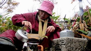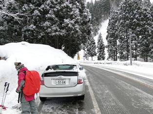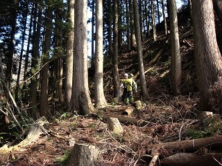 ![]() お天気が良い。眺めが良い。80分近く食事をしながら長居をした。12.10.頃より同じ道を降りる。雪が解けてごぼるようになった。 ![]() 杉のゴロゴロ転がる道は、やがて整備されて登り易く成るだろう。13.15.登山口に降り立つ。 ![]() 国道から少し入った地点で、お湯を沸かして抹茶を頂く。初めての山だったが素晴らしい山だった。教えてくれた国府のX氏に感謝。花の咲く頃にまた登ってみたい。 失敗談を一つ。頂上で、X氏の資料には「こけもものみち(苔桃の道)」と書いてあったから、夏には苔桃がいっぱい咲くのかも知れないね、と話したが、帰って資料を読み直したら「このけものみち(この獣道)」だった。まったくの早とちりに一人で大笑い。 |