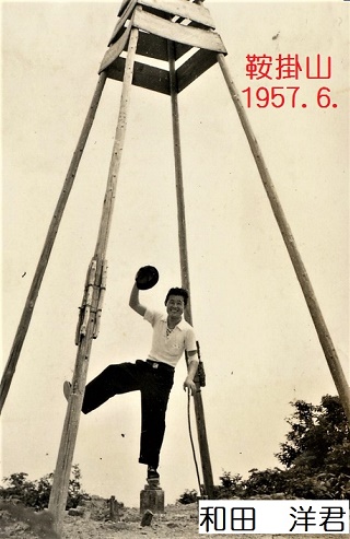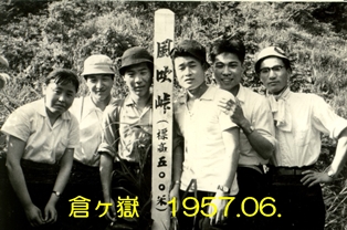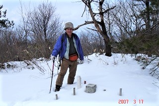 11.37分.頂上到着。N女史が松の木に上って山名札を下げる。この三角点は二等である。少し格上である。