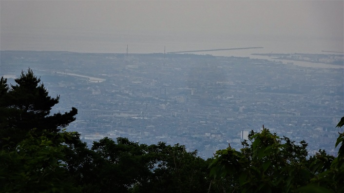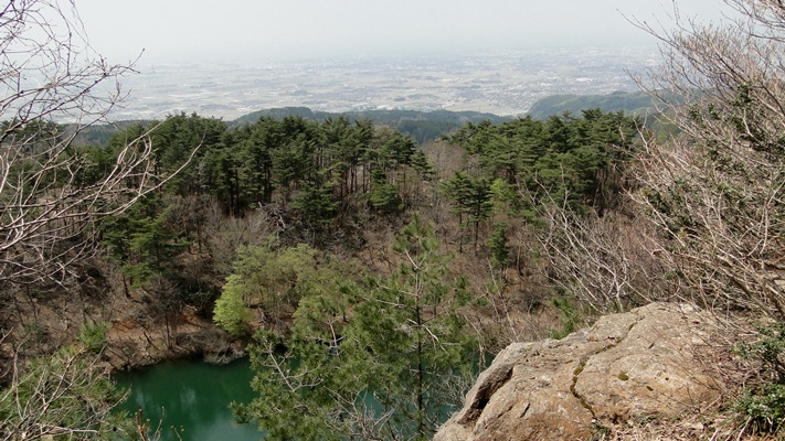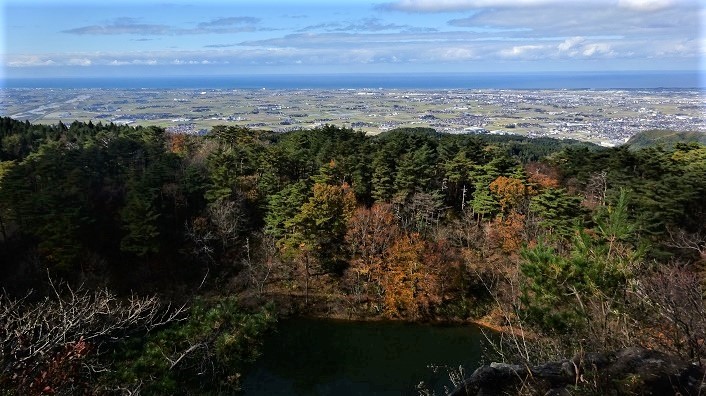 頂上からは山のほうが少し展望できるが平野の方はは見えない。降りは崖を降りずに、周回道を通り大池の向こう側に降りる。途中、大池を下に見、向こうに加賀平野を望む絶好の展望台がある。