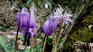 又遠回りになるが、「カタクリ」が多く見られる。山の斜面がぎっしりと埋まっている所がある。まだ早いのか花は少ない。「スミレ」も咲いている。