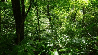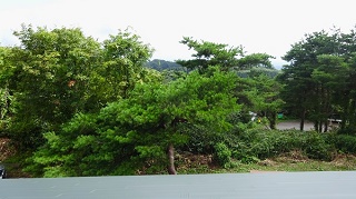 ![]() 神社の後ろにブナの林が広がっていて、遊歩道が下りている。 ![]() 少し降りて、山の龍宮城という小屋に入る。小屋の裏からは海が見える。千里浜方面らしい。 |
