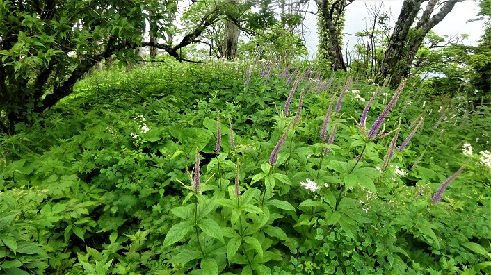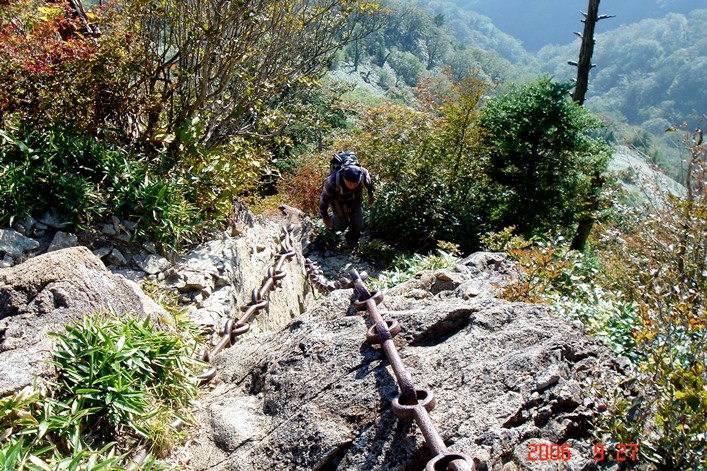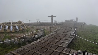 2019年07月24日-25日・3回 成就より「石鎚山」往復 四国には日本百名山が二山ある。「石鎚山」と「剣山」である。13年前にK君と一山づつ、遍路巡りと兼ねて、登って来た事がある。今回はS女史に誘われて、二山一緒に案内する事になった。早朝5時に車で出発。北陸道-舞鶴若狭道-山陽道から、しまなみ海道で四国に入る。なかなか遠い。今治に上陸し西条市で「石鎚神社」の本社に参拝する。 ![]() 13.50分に「石鎚神社本社」に到着。石鎚山を御神体とする石鎚神社の口之宮である。今日泊まる「石鎚神社成就社」は中宮。頂上の石鎚神社は奥社である。 ![]() 石鎚山の開山の「役ノ行者」の像がある。 ![]() 本殿に参拝し、境内を一周して、ロープウェイ駅を目指す。 ![]() 15.00時にロープウェイ駅の下の、土産店の奥の有料駐車場に車を入れる。二日間分で1400円。すぐ前にロープウェイ駅へ登るが分岐している。 歩いて登って行くと、石像が並ぶ広場がある。神社なのかお寺なのか、どちらかな。 ![]() ![]() 往復1950円。20分ごとに出発。誰も居ない。我々二人だけ。 ![]() 中々高度差がある。向かい側の山も、地図を見ると登れるらしい。 ![]() ![]() 30分位い、ぶらぶらと登って行く。 ![]() ![]() ブナの木がある。鳥居が見えてくると成就である。16.00時。 ![]() 宿屋が3軒くらいと、突き当りに「石鎚神社・成就社中宮」がある。すぐ参拝、安全祈願である。 隣の「遥拝殿」に入ると、初めて「石鎚山」が見えた。頂上にガスが架かっている。 ![]() ![]() 成就社前の「白石旅館」に泊まる。13年前もここに泊まった。驚いたことに他に宿泊者が居なかった。登山する人は、日帰りの人が多いのだろうか。 二日目 ![]() 5.00時に起きて、5.40分に、食堂に置いてある朝食のおにぎりを受け取って、宿を出発する。成就社と旅館の間の「神門」が登山口である。登山路は段々と降って行く。標高差100程降る。 ![]() 大きなブナがある道であ。八丁坂と云うらしい。 ![]() 途中に鳥居があり遥拝所である。木の間に頂上が見える。 ![]() 登りになり「試しの鎖」に出る。この鎖は登ると、ピークに登り着き、急な崖を降って前社ヶ森の小屋に出る。鎖を上らなければ、裾を周って小屋に着く。登らなくてこの鎖パスをする。7.35分。 地図にある「剣山」というピークに登り出す。振り返ると向こうの山の鞍部に「成就」が見える。手前の岩峰のピークは「前社ヶ森」のピークである。試しの鎖を登ると展望は良さそうだが、怖いだろうな。 ![]() 「剱山」は頂上を巻いて行く。石鎚山が近くなってきたぞ。 ![]() 「夜明峠」へ一度降る。8.15分。 ![]() 瀬戸内海が見える所がある。 ![]() 8.40分に「一の鎖」に着く。S女史は登り出した。私も一の鎖だけは登ろうと考えていたが、少し登ってみて、年寄りは無理をしないでおこうと、やめて巻き道に戻った。前回は1と2の鎖は登ったのになアーー。 ![]() 「二ノ鎖元小屋」の建物が見えてきた。 ![]() ![]() 鳥居があり、土小屋からの登山路が合流している。新しい休憩所とトイレがあった。 S女史は二の鎖にも挑戦。私は巻き道を行く。勾配が急になり、ほとんど階段かハシゴである。梯子は登りと下りの二重になっている。 登って来た方が見える。成就社の平地が見える。 ![]() ![]() 三の鎖はS女史もパス。さすがの彼女も疲れたらしい。頂上小屋の横を通って、「弥山」の頂上の「石鎚神社奥社」に到着。10.20分。 ![]() 隣の「天狗岳」が見える。ここ「弥山」よりも10mほど高い。四国最高峰である。思ったより人が少ない。2.3人しかいない。神社に参拝。 ここから「天狗岳」は、私は前回登ったので今日は、ここ弥山までと決めている。 ![]() 相棒S女史は荷物を置いて、登りに行った。今は誰も登って居無い様だ。彼女だけが細い岩の尾根を登って行く。見ているだけで怖い。 ![]() ![]() 頂上近くまで登っているのが見えたのだが、いつまで待っても頂上に現われない。少し心配になった頃、ようやく頂上に姿を現して、ホッとひと安心。あとで聞いたら、行き過ぎて次のピークまで行こうとしたらしい。タブレットのヤマップ地図を確認して、戻ったらしい。 ![]() ![]() 私が以前登った時はガスが掛かり、あまり高度感は感じなかったが、それでも怖くて座り込んでいた。彼女は平気で立っているぞ。 下山を開始したぞ。 ![]() ![]() ![]() 無事帰還。食事をして、記念撮影を頼んで、11.20分頃に下山開始。降りは、鎖場は二人とも通らない予定。 ![]() ほら貝を持った白衣の人が登って来た。 ![]() 途中からだんだん天気が悪くなり、雨が降り出した。ポンチョを着る。八丁坂を登る頃はざあざあと降った。雨の登山は久しぶりだ。暑くて風が無いので、雨が降っても急坂地帯は過ぎていたし、滑らないように気を付けるだけで済んだ。白石旅館に登り着いた頃には雨も止んだ。15.55分。 ロープウェイで降り、車に着いたのは17.00時近く。 今朝、宿を出て頂上を往復し、駐車場まで降りて来るまで、12時間近くも掛かっているなんて、我なが