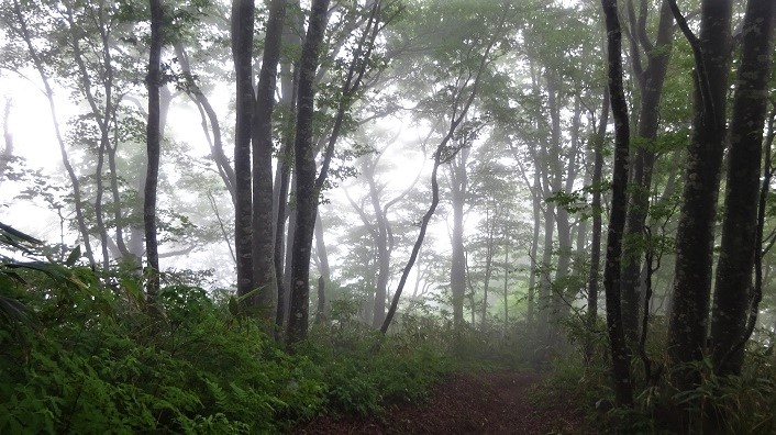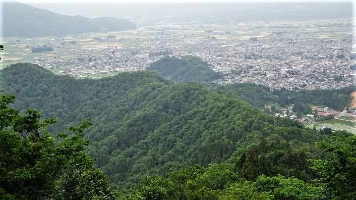 城内は冬季休館中で入れない。 展望の良いお城である。 ![]() 右「経ヶ岳」。左「報恩寺山」。間に「白山」がちょっと頭を出している。「戌山」から見るのと同じだが、白山の見え方が違う。ちょっとしか見えない。 ![]() 「荒島岳」が、日本百名山の風格でそびえている。 ![]() 「経ヶ岳」方面。 ![]() ![]() 急階段は降りたくないので、帰りは南登山口の方へ降りた。くねくねの車道で、時々カット階段がある。南登り口の門に着いた。14.15分。ここにも駐車場があった。 ![]() 山のふちをぶらぶらと歩くと、すぐ西登り口の駐車場に戻り着いた。14.25分。前方の山の高いのが「飯降山」で、その下辺りが「天空の城撮影地」。右が「戌山」の頂上である。 ■次回登山は、富山県「稲葉山」へ■ 2019年06月09日(日)2回 飯降町より「飯降山」を往復 この間から福井の山ばかり登って居る。一つ登ると近くの山が見え、また登ってみたくなる。「飯降山」も2回目である。加賀ゆめのゆ7.30集合で、福井北ICで降り無料中部縦貫道で大野市を抜け、山すその飯降町の、飯降公民館に車を置く。登山用に広い駐車場がある。一台も留っていない。8.50分。![]() 100m離れた所に登山口がある。「飯降白山大権現」の石碑がある。 ![]() 10分ほど登ると社殿がある。社殿の側面に大権現縁起が書いてある。「この山は泰澄大師が開基の山である。大師16歳の時、越知山で修行中、白山の方に金色の光が見えたので不思議に思い、飯降山に登山してみますと、白山三社権現のお姿がお立ちになっておられました。また東の方にも金色の光が射す山が見えたので、尋ねて登ってみると、荒島大権現がお立ちになっており、我こそは東方瑠璃光世界の主であり、待つこと久し、共に衆生を救わんと約した。大師は飯降山に270余社の社を開かれた。・・・大師は鍋や薪の用意もないのに、時々ご飯を食べておられるのは、ご飯が天から降ってくるのだろうと、人々は云った。」 ![]() 社殿の裏の林道を100mほど進むと、右手に登山路が分岐している。以前間違えて林道をそのまま進んだことがある。 ![]() 気持ちの良い道が続く。9.30分頃分岐で休憩。「戌山城址」から登ってくる道らしい。 白い花ばかりだな。 ![]() ![]() ![]() ![]() ![]() ![]() ![]() ![]() 10.10分4合目標識の近くで抹茶休憩。今日のメンバーはK君とS女史。 もっと天気が良いと思っていたのに、降りそうになってきた。展望地点があった。大野市が見える。 ![]() 「大野城」が見える。霧の中でこの城が浮かんでいる写真を見たことがある。ひょっとしてそんな光景が見えるかもと期待していたのだが・・・。 ![]() ![]() ![]() ![]() 6合目11.00時 ![]() 11.30分頃に、林道が登ってきている地点に到着。電柱があり、何か建物がある。展望が良いはずだが、霧雨になった。二人は合羽を着た。私はどうせ濡れているから着ない。 ここを過ぎるとブナ林に入る。霧で幻想的である。 ![]() ![]() ![]() ![]() 11.50分・9合目 12.05分に奥の院に到着。前の展望地点は真っ白。 12.10分に頂上三角点。ここが頂上だが展望がないので、先へ進む。