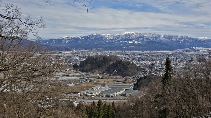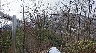 ![]() 11.20分に分岐まで戻り、北側の「戌山城址」の方へ登り出す。上に近づくと急坂で、ロープが下がっている。ピークに登り切ると、そこは「戌山城の南出丸」らしい。越えて少し下ると尾根の町側が大きく開かれ、ここが天空の城の撮影地だった。 目の下に、盆地の大野市街。亀山がありその頂上に「越前大野城」が見える。 ![]() その丁度上に、「白山」が頭を出している。 ![]() 右の山は「経ヶ岳」。左の山は「報恩寺山」その間から「白山」が顔を出している。 ![]() ここで撮られた「天空の城」の看板があった。このような写真が撮れるようだ。同じ構図で写真を撮ってみた。冬を中心に年間15回くらい、このような状態になる様だ。そんな時はここに150人くらい登ってくるという。今日は霧は無し。観客無し。 ![]() ![]() ![]() さらに進むと「戌山」頂上に到着。戌山城址主郭部である。「飯降山」が近い。11.55分。 ![]() 広いが展望なし。ベンチがあり、一人で昼食だ。 ![]() 「みくら清水」登山口の方へ降りる。ロープが時々出てくる。 ![]() 「みくら清水」に降り立つ。城まで日に三回水を運び上げたと書いてある。 ![]() ![]() 「みくら清水」から車を置いた所は、すぐ近くである。13.10分に到着。 地理院地図を見ていると、すぐ近くの農道の近くに三角点があるので確認に行く。三角点は「飯降山」の見える農道の真ん中にあり、道路に埋め込まれていて、鉄の丸い蓋の中にあり、見ることが出来なかった。