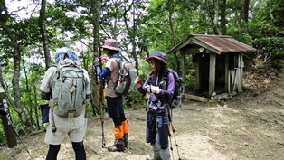 11.40分、「根来坂峠」に登り着く。ここは福井県滋賀県の県境である。小さい祠がある。県境の尾根を通っている「高島トレイル」の標識がある。ここは尾根を通っている「高島トレイル」に、「鯖街道」の峠越えの道が横断している「四辻」である。ところが「百里ヶ岳」への登山路はここから、Uターンするように方向を変えているので、方向がつかみにくく、ややこしい。