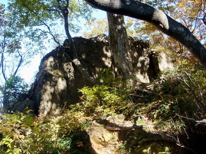 1985年07月02日の「謡曲・山姥の洞」探訪記 謡曲に「山姥」という曲がある。都の百萬山姥という遊女は、山姥の山廻りをクセ舞に作って謡って有名である。遊女は善光寺に参拝を志して、越中越後の国境の境川に着く。ここより険阻な上路越えに掛かり、本物の山姥に出会うという話である。 ![]() 私の大好きな曲である。能楽師の一員として、山姥に興味があり、山姥が住んでいたという上路の山姥洞の探訪に、お弟子の山好きを集めて登った事がある。境川に沿って遡り、上路の村を抜けた先の登山路より徒歩で3時間ほど歩いた。 ![]() この川ではないが、途中に深い川があり、橋が無くて渡るのに苦労した記憶がある。 ![]() この「山姥の洞」は、富山の能楽師・千章修師に場所と登山口を教えてもらって実行した。先生は自身でお弟子たちと登って記念の「立札」を立ててきたという。 ![]() ![]() 我々も白鳥山の中腹の山姥洞を尋ねて、記念の「立札」を立ててきた。無地の立て札を被いて登り、山の上で署名した。日付を見ると昭和60年とある。もう20年以上も前のことだ。頭の髪がふさふさで真っ黒だ。俺にもこんな時期が在ったのだ。 ![]() 富山の能楽師・千章修師の御社中の「立札」は太い角棒に墨書してあり、墨が消えないように漆が掛けてあった。私の後ろに写っているのがそれだと思う。 なかなか大変な登山だったと記憶している。 2007年10月25日(木)初登山 山姥洞-頂上-坂田峠 ![]() 今回はこの「山姥洞」を経由して、頂上の「白鳥山」を目指す。K君に同行を願う。登山路を調べていると、白鳥山の中腹まで山姥林道が出来て、山姥洞までは登り易くなったようだ。小矢部サービスエリアで待ち合わせ。車2台で朝日インターを降り、8号線を走り富山・新潟の県境の境川を遡る。突き当たりの上路の村に8.30分に到着。さらに上路橋立林道を進み、7.8分で右に山姥林道が分岐する地点に到着。直進する橋立林道は工事のため通行止めになっている。右に曲がり山姥林道に入る。舗装してあり快適である。8.45分に坂田峠の下に到着。真っ直ぐ行けば峠の上で、右の巻き道が山姥林道である。この分岐に10台以上置ける駐車場があり、更に山姥林道をちょっと進むと20台以上の大駐車場がある。へぇーこんなに人気の山なのだ。 ![]() 分岐に車を一台置き、山姥林道を進むと、9.00時に林道の終点に着いた。広くなっており車は10台以上置ける。ここまでは完全舗装だった。 ![]() 天気は快晴。紅葉も中々のもの。駐車場の突き当りから登山路に入る。緩やかな道だ。途中で前回の上路村から登った道と合流するはずだったが、気付かないうちに山姥洞までたどり着いた。歩き出して30分少々だ。 ![]() 大きな岩の下が洞窟になっており、山姥の住処ということである。能楽界の大先輩の、佐野萌師の御社中の探訪記念の標識がある。日付けはちょうど1年前である。我々の22年前の標識なんか、もちろん何処にも残っていない。 ![]() 洞の上は平らな一枚岩になっている。立札に拠れば「山姥の踊り岩といわれ。花盛りの春・紅葉の秋・月夜の夜、近くの「鼓ヶ滝」の音に合わせて、山姥が舞い踊ったという。」岩上に立てば上路の里が一望できる。岩の一段下に江戸時代の仏像が二体在る。 ![]() 30分ほど休憩して今回は白鳥山を目指す。 ![]() ![]() 洞の先に鼓ヶ滝の矢印がある。10分と書いてある。10.05分に洞を出発、細い尾根をゆく。10.18分に滝が木の間に見えて来た。洞を過ぎた途端に登山路が荒れてきた。あまり人が通らぬようだ。登山路は滝の左を巻くように遠回りして滝の真上に出た。小さな滝である。ここで水を飲む。滝の上を向かい側に渡って登山路は付いている。 やがて急な登りとなり立山杉が次々と現れてくる。国土地理院の地図には、登山路は記入されていないが「鳥居杉」の記入がある。何の事だか判らなかったが、11.10分に「鳥居杉」の札の下がった立山杉の下を通った。鳥居のように下を潜り抜ける杉の木である。 ![]() ![]() 11.30分、尾根上の栂海新道に合流。右に折れ頂上を目指す。登山路は広くなり紅葉のトンネルである。 ![]() 11.50分、白鳥山の頂上に到着。でかい二階建ての避難小屋がある。小屋の裏手に回ると三角点が在り、小さな頂上広場である。屋根の上が展望台になっている。鉄梯子が掛かっているが怖そうだ。 勇気を出してK君のあとから登る。怖い怖い。展望台にたどり着いても立ち上がることが出来ない。座り込んだまま四方を眺める、まさに360度の眺望である。 まず白馬岳方面。栂海新道は、ここから白馬岳まで縦走路がつづいている。犬ヶ岳・朝日岳・雪倉岳・白馬岳と続いているが一直線に並んでいるので、判別し難い。微かに冠雪の見えるのが白馬だろう。 ![]() 山と山との間に、白く雪化粧した山が見えた。よくよく眺めてみると「剣岳」である。その肩から「立山」も覗いている。 ![]() 海のほうは、糸魚川の平野が近い。 ![]() 西は、遡ってきた境川が見える。あすこから糸魚川までが、