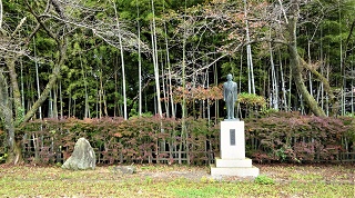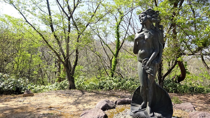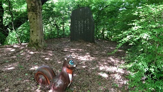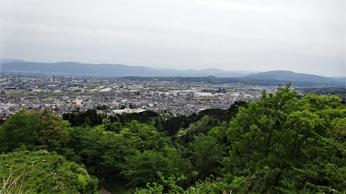 ![]() ![]() ![]() ![]() 帰りは又「鉄塔№94」に登り返す。登りの時は気が付かなかったが遠くに平野が見えた。 ![]() 国道に置いた車が見える。11.40分。2時間の徘徊だった。 この後、車に乗って、小矢部市城山町の「城山公園」を目指す。続きは下の稿。 2021年05月12日(水)8回 御坊山-城山公園より「おやべ城山」往復 「御坊山」より降りて、ナビに「城山公園」と入れたら、小矢部の市内を抜け細い道ですんなりと城山公園に入り込めた。駐車場が判らず桜並木の道をまっすぐに登って行ったら、駐車場では無いが大きな空き地があったので車を留める。案内図の現在地に車を置く。一番下から桜並木をまっすぐ上がって来た。城山は各地にあり、ここは「おやべ城山」である。ここから城山に登る予定。12.05分。 ![]() ![]() すぐ横が分岐点で「今石動城址まで1.4km」の標識がある。女性が一人降りてきた。山菜取りのようだ。この山で出会ったただ一人の人。 ![]() 新緑の舗装してある林道を登って行く。細い林道だが通行止めになっていないので車は通れるのだろう。 ![]() ヘアピンカーブを曲がる。今石動城址1.3kmの標識。車は曲がれないので、突き当りの広場でUターンするらしい。広場には、秩父宮記念碑と桜井与蔵氏像がある。 ![]() 峠の上から、少し降りてゆく。地図を見ると右手前の崖の上が頂上らしい。登り口はまだ先の様だな。 林道にカキツバタが咲いていた。マムシグサ。オオカメノキ。かな。 ![]() ![]() ![]() ![]() 峠を過ぎて少し下がった所に登山口があった。山に入るハシゴがあった。案内板もある。この上が本丸跡で、本丸跡が城山の頂上である。 ![]() 途中にもまたハシゴがある。観光客でも登れるようにしてある様だ。 ![]() 登山ならばこんな坂はハシゴを掛けないだろうな。本丸跡に登り着く。12.35分。背後は太い杉があるが、小矢部市街の方は大展望である。スギ林の下で昼食。 市街の方は木が切ってあり、崖になっている。右の山は医王山と思われる。 ![]() 左の方は高岡市まで見えるのかな。一段下にある広場は二の丸辺りらしい。 ![]() 真ん中に小矢部クロスランドタワー。晴れていれば北アルプスも見えそうだが。 ![]() 下に降りる階段があったので二の丸に降りて見る。ここから林道まで降りる道があるのかな、と思っていたが周りは崖ばかりで、見付からない。すぐ下に林道が見えるが、老人には降りられない、ワラビを摘んで本丸まで戻る。 ![]() ![]() 13.45分。車まで戻り車に荷物を置いて、公園の探索に出掛ける。太い桜並木を進んで下って行く。 ![]() 神武天皇の銅像がある。近くにもう一つ銅像があり、広い駐車場があった。 ![]() 少し戻って、十辺舎一九の歌碑の横から下に降りてゆく。 ![]() 野外ステージがあり、菖蒲園が上下二か所もあるが、どうゆう訳か花が無い。残念。 ![]() 大谷池まで降りてきた。 ![]() 橋の上から黄色い菖蒲が見えた。この辺りは公園の入口辺りだな。 ![]() 桜並木を上がって車に戻る。車を置いた広場の奥に階段があったので登って見たら、句碑があった。倒れていた案内板によれば、芭蕉の弟子、支考の「裸子よ、物着はやらん、瓜一つ」と書いてあるらしい。 ![]() 芭蕉の「花むくげ、裸わらわの、かざしかな」という句の跡を訪ねての句らしい。「花むくげ塚」が菖蒲園の近くにあったのを、案内板に載っていたのに、見逃してきた、残念。 ■次回登山は、5/15小矢部「城ヶ平山・清水山」へ■ 2021年04月21日(水)7回 宮島峡より「俊寛塚」往復 月初めのこの間「稲葉山」を歩いて登った。宮島峡のすぐ近くである。ここから稲葉山に登っている人も多い。いろいろ調べていて、21年前に「能楽古跡探訪」で「俊寛塚」行った事を思い出した。このたび宮島峡のハイキング道に、12体の「ヴィーナス像があり、それを訪ねて「宮島緑の村」まで歩いて居る記事を見付けた。確か「緑の村」のキャンプ場に「俊寛塚」があったはずだ。老人もヴィーナス像に会いに行き、俊寛塚を再訪だぞー。 ![]() 国道8号線から宮島峡の方へ入る。この間の稲葉山もここから入った。一本道で宮島峡へ入ると「一ノ滝駐車場」がある。トイレ舎があり下に一ノ滝が見える。案内板に12体の「ヴィーナス像」があると書いてある。八重桜が咲いている。ここから歩き出す。 まず「一ノ滝」に降りる。横に長い滝である。甌穴がいっぱい空いている。 ![]() 車道まで上がると、➊番目の「紺碧の像」がある。ギリシア神話の「水瓶で水を汲むヴィーナス」である。バチカン美術館にある像の写しらしい。 ![]() しばらく歩いて河岸の遊歩道に降り進む。宮島温泉のそばを通りる。「二ノ滝」に降りる。よく見ると滝の向かい側の崖の中の、くぼみの中にヴィーナス像が見える。 ![]() ➋番目の「水辺の像」である。案内板が見当たらないので詳しい事は判らない。この像だけは近寄れないし、見付けにくい。 ![]() 下の滝のすぐ上に低い滝がある。この滝も「二ノ滝」に含まれている様だ。 ![]() しばらく車道を歩