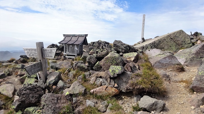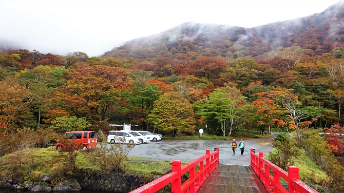 ![]() 上から見ると登って来た方に、噴火口跡みたいな広場が見えて、食事をしているのが見える。我々もそこへ降りて昼食にする。少し風が強いので、ここは最適である。天気が悪くなりガスってしまって残念である。 ![]() 最豪華昼食。山歩きのパーティーは女性に限る。美味しいものが色々と出てくる。 ![]() 食事を済ませて、あとは一目散に下山のみ。年寄りは一目散にゆっくりゆっくり。15.00時に神社に到着。扉を開けて広場に出る。 ![]() 振り返ると白根山頂上に、雲がかかっている。この年になって、日本百名山の登頂が一山増えるとは思っていなかった。51番目である。 先着三人熟女はお待ちかね。広場の足湯がにぎわっている。足湯の先に大きなテラスが作られている。山がいっぱい見える。山名板によれば、ここから日本百名山が10山見えるらしい。写真も載っているが、霧で判別がつかないのもある。 10山見えるという日本百名山の名前を、左から順番に記録しておく。「浅間山」「四阿山」「草津白根山」「武尊岳」「苗場山」「谷川岳」「巻機山」「至仏山」「平ヶ岳」「燧ヶ岳」以上。 ![]() ![]() 15.30分にロープウェイで降りる。ロープウェイ乗り場駅の中に、入浴施設があった。駐車場の車に荷物を置き、入浴。 帰りは若い人に運転を任せ、小松には23.00時過ぎに到着した。 ■次回登山は、9/27「乙坂山・長泉寺山」■ 2017年10月15日(日)2回 大沼より「赤城山」を一周 昨日は、谷川岳の一ノ倉の岸壁を眺めてきた。下から眺めたのは初めてで、なかなか良かった。そのあと高速に乗り、赤城山山麓の群馬県渋川市の北橘温泉に泊まった。近くを利根川が流れている。 ![]() 今日は「赤城山」である。朝食は7時からで早くて良い。食事を済ませて7.45分頃出発。コンビニに寄り食料調達。県道4号「上毛三山パノラマ街道」を上る。天気が悪い。霧雨もよう。町中は紅葉していないが、登るにつれて段々と紅葉してくる。 9.05分に大沼付近の大きな駐車場に到着。紅葉している。トイレがある。天気が悪くて車は少ない。 9.25分に出発。大沼湖畔を歩く。池の向こうに「地蔵岳」通称アンテナ山。 ![]() 9.35分に赤城神社。赤い橋を渡る。バックは赤城山主峰「黒檜山」。これから登る。 ![]() 神社裏から、湖面に影を映す「駒ヶ岳」。あそこから降りる予定。 ![]() ![]() 10.00時、赤城神社より少し歩いて登山口到着。「赤城山最高峰・黒檜山登山口」と書いてある。 貸切バスが着いて、団体さんが登って行く。我々も今日のコースを地図で確認して、急坂を登り出す。 岩ごつごつの登山路。尾根まで登り、尾根歩きとなるが景色は見えず。 ![]() ![]() 11.10分、大沼が少し姿を現した。向かいはアンテナ山。下は赤城神社。車を置いた駐車場も見える。 ![]() 「アンテナ山の左どなりに富士山が見えます」と書いてある。向こうの山は駒ケ岳。 ![]() ![]() 12.15分に分岐を左折。5分で「黒檜山」の頂上到着。誰も居ない。 ![]() さらに先へ進み、12.20分に、絶景スポットの昼食場所に到着。ここにも誰も居ない。仲間二人は霧の中かと、声を出して呼んでみたが、返事無し。あんまり私が遅いので、もう下山したらしい。とりあえず座り込んでしばしの昼食ですぐ下山開始。 12.48分に「黒檜大神」の碑のある祠を通過。12.52分に分岐を駒ケ岳の方へ降りだす。 ![]() ![]() 13.55分「赤城・駒ヶ岳」に到着。団体さんも到着。今日は日曜日。団体さんの登山が多いね。 右下に大沼が見える。小さいので考えてみたが、赤城神社の裏の部分らしい。 ![]() ![]() 駒ケ岳の張り出した尾根の先から、急な斜面を降りだす。すこぶる急な坂で、所々に長い鉄製の階段が懸かっている。 ![]() 雨で、ほとんど階段ばかりの下山路は滑りやすくて怖い。ヘッピリ腰でもたもたしていたら、後ろから追いついて来た団体さんのリーダーに、降りはもっとポールを長くしてと注意される。 ![]() ようやく大沼が近づいて来た。 ![]() お待たせしました。15.25分にようやく車に到着。先着二人は、近くの湖畔の売店で暇を持て余していたが、あまり遅いので心配になり、下山口で降りてきた人に、それらしき老人は居なかったと聞いたそうだ。まだまだですよ、と言われたそうな。お二人は足が速すぎですよ。私の計画書では、15.30分着になっていますから、予定通りですよ。昨日宿で貰った、宿隣の「ばんどうの湯」という入浴施設の無料券で、ゆっくりと入浴。予定通り夜遅く小松迄帰り着く。 「YAMAP」記録 ■活動日 2017/10/15(日)09.10-15.26 ■活動時間 6時間16分 スタート9.10→(2時間56分)→黒檜山12.08-12.12(4分)→ (1時間39分)→駒ケ岳13.47-14.04(17分)→(1時間25分)→ゴール15.26 ■活動距離 5.7km ■高低差 491m ■累積標高上り/下り 743m/748m ■次回登山は、10/21・白峰「大なだれ山」へ■ |