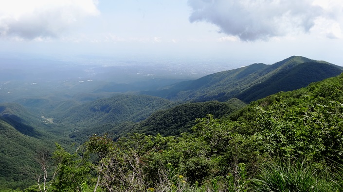 5分ほどぶらぶらと、尾根の突き当りまで行くと展望台があり、7.8人が食事中。 ![]() 目の下の大沼は少ししか見えない。 ![]() 北の方は、日光・尾瀬の方面であるが、山は見分けがつかない。 ![]() ![]() コンビニおにぎりをほおばって下山開始。頂上まで戻り、分岐まで降りて先へ進むと「黒檜山大神」の祠があった。ここも頂上の一角である。伸び上ってみたら「小沼」が見えた。その先に広がる平野は、前橋市辺りかな。 祠の少し先で分岐に出る。直進は「花見ヶ原キャンプ場」への道で、「駒ヶ岳」への道は、右に急坂を降って行く。 ![]() ![]() 黒檜山より急坂を降りると、平らな地帯が続く。振り返ると、降りて来た黒檜山が聳えている。 大タルミと云う地点を通る。黒檜山まで標高差220mと書いてある。220m降りて来たのだ。 少し降って、登り返した所が「駒ヶ岳」だった。13.30分。関東の方の平野が見える。 ![]() ![]() 駒ヶ岳は、あんまりピークらしい感じがしない。 ![]() 尾根の突端まで進み、そこから急に大沼の方へ降る急坂となる。 ![]() 急坂には、鉄の長い梯子が掛けてある。リュックを背負っていると、すれ違い出来ないほど狭い。 ![]() 14.30分、登山口の車道に降り立つ。車を置いた駐車場は、目と鼻の先である。 ![]() 登りに使った「上毛三山パノラマ街道」を降りて、渋川の町を抜け、伊香保温泉に上って泊まる。地図を見るとこの道も「上毛三山パノラマ街道」となっている。 7月29日 榛名山 翌朝、宿を出て「榛名山」に登る。榛名山も赤城山と同様に、榛名湖を取り巻く外輪山や側火山の幾つものピークからなっている。榛名湖はカルデラ湖で「榛名富士」は中央火口丘である。 ![]() ![]() この「榛名富士」にはロープウェーが掛かっている。 ![]() 青い帽子の児童たちは、ロープウェーの頂上駅の広場へ、下から徒歩で上がってきた。皆さん元気が良い。 ![]() 頂上駅から7.8分登ると頂上に着いた。思ったより木が茂っていて展望が無かった。家へ帰ってから榛名富士の標高を調べていたら、このピークに1等三角点が在ったのだ。子供たちでごった返していたので、三角点には気が付かなかった。残念。