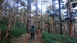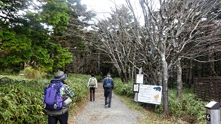 2017年11月03-04日(金-土)3回 初登頂 「大台ケ原山」は、今年9月に出かけたが、台風で登山を諦めた。3年前にも悪天候で諦めている。どうも大台ケ原山には縁が無いなぁーと思っていたが、S女史が登りたいと言ってきたので、3度目の正直で挑戦することにした。10月25-26日の土日を大台荘に予約したが、またもや台風が直撃しそうで、3-4日に変更してもらった。何とか今回は、雨マークが無いので登れそうである。 第一日目 ![]() 小松を7時に出て、高速を乗り継いで、名神から京滋バイパスで、橿原市に出る予定だったが、三連休で草津PAで渋滞に巻き込まれなかなか動かない。そのあと吉野川に出た所で、吉野川沿いの国道が前回の台風で通行止め。迂回路は非常に遠回り。三茶屋という所まで走らされて、ようやく吉野川に戻る。大台ケ原ドライブウェイに入ると、初めは道が細くてすれ違いに苦労する。途中の工事個所の信号待ち、紅葉が奇麗になってきた。ドライブウェイは段々と道が広くなり、安心して走れるようになる。 途中の広い場所で写真を撮る。山並みは、八経ヶ岳と大峰奥駆道の山並みと思われる。 ![]() ![]() 15.20分に終点の駐車場に到着。8時間以上も掛かってようやくたどり着く。大きな駐車場である。夕刻が近いので空いていた。まず大台ケ原ビジターセンターに入って、情報収集。 ![]() ビジターセンターの横から登山口がある。今日はここから「苔道」という遊歩道を一周の予定。 ![]() 苔道といっても、秋の今頃は苔なんてほとんど残っていない様だ。 ![]() ![]() 開祖大教正古川嵩之墓と書いてある。 ![]() 20分ほどで苔道一周。16.10分に、登山口のすぐ横にある「心・湯治館」に入る。ここの大広間に、相部屋の寝具だけの宿泊、二食付きで予約してある。今日は何十人も宿泊者が居るようだ。 明日は6時より食事が出来る。今回歩いた地図を載せておく。20時には寝てしまった。 ![]() 第2日目 ![]() 6時にすぐ食事。6.30分に駐車場。だいぶ車が残っている。 ![]() 登山の前に散歩。大台教会の方へ降りてみる。 昨日見かけた墓の、「古川嵩」の建てた教会らしい。明治の人でこの辺りを拓いた人らしい。教会といってもキリスト教には関係なく、御神体を持たず、自然讃美を教義とする神道、との事である。 ![]() ここから隣接する「西大台ヶ原地区」は、有数の多雨地帯で、トウヒ・ブナの原生林が残る貴重な森、昔の大台ケ原の面影を残しているようで、立入禁止になっている。立ち入りには許可が必要で、一日に20人とかと聞いたことがある。 ![]() ![]() 車まで戻って登山の用意。7.45分にビジターセンターの隣の登山口より出発。 ![]() 苔道、中道も同じ登山口である。しばらく歩くとそれぞれ分岐がある。 最初は平坦な道。前方の一番低い地点に登るようだ。 ![]() ![]() 8.25分に尾根筋まで登り着く。展望台があり熊野灘が見えます、と看板がある。海は案外近いのだ。この海から湿った空気が吹き上げて、大台ケ原にぶつかるのでここは多雨らしい。 ![]() ![]() 左に最高地点「日出ヶ岳」を目指す。階段が続いている。 ![]() 頂上に展望櫓があり、横に一等三角点がある 雲で出てきて遠くは見えないが、展望の良い頂上で360度見渡せる。大杉谷の方へ道が降りている。 ![]() ![]() 木の陰に駐車場が見える。 ![]() ![]() 熊野灘の辺り、雲の間より光が差した。 ![]() ![]() 記念写真を撮ってもらって、さっきの展望台の方へ降り、正木峠の方へ縦走に入る。 正木峠頂上に近づいて振り返ると、日出ヶ岳が見える。頂上に展望櫓が見える。 ![]() 一面の笹原で、トウヒの立ち枯れか目立つ。元は苔むしたトウヒの森だったが、1959年の伊勢湾台風で森林が破壊、木々の流出や運び出しで苔類が衰退。笹類がが繁茂、笹を食べる鹿が登ってきて、木々までも食べてしまったようだ。現在木を植えたり、鹿予防の柵などを設置したりしているようだ。9.45分。 ![]() ![]() この辺り笹の背が低いのは、鹿が食べるかららしい。 ![]() 正木ヶ原。9.45分。 ![]() ![]() 尾鷲辻。中道の分岐点。あずま屋がある。10.00時。 疲れたら一周しなくて、ここから帰る予定。 ![]() 牛石ケ原。平らで休憩場所である。大台教会が建てた神武天皇像。10.15分。休憩。 ![]() 10.35分に大蛇ー分岐点。荷物を残して大蛇ーの方へ降りてゆく。途中で右手隣に大岩壁が望める。よく見ると岩壁に登攀者がへばりついている。4.5人で岩登りをしているようだ。地理院地図によれば、蒸篭ー(セイロー)という岩壁らしい。見ているだけで怖い。 ![]() ![]() 10.50分に大蛇ーに到着。細長い岩の道がこの先30mほど下っていて、両側が鉄柵に鎖で、切れ落ちている。人で渋滞。子供たちも混じっている。一番遠くの岩の上に立つだけで怖い。誰も居なかったら四つ這いで先まで行き、写真を撮ろうと思っていたが、やめてすぐ戻った。 分岐まで戻り、シオカラ谷の方へ降り始める。この道は階段があり高低差ががあるので注意と書いてある。こちらにはブナの木があり紅葉が残っている。 ![]() 