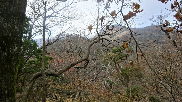 ![]() 明日登る予定の「天城山・万三郎岳」が見える。真ん中奥。右手前の大きい山は「遠笠山」。左奥の大きい山は「箒木山」と書いてある。 富士山を眺めながら降りて行く。この先少しだけ階段がある。 ![]() 真ん中奥の小山は「小室山」と云うらしい。ツバキ・ツツジの名所らしい。 ![]() 「五智如来地蔵尊」があった。寛文の初め頃、神奈川の網元が大室山浅間神社に娘の安産を祈願し、無事出産したので奉納したとの事。一体三部分を15回かけて強力が担ぎ上げた。富士山も見える。 ![]() ![]() 一周してきたぞ。富士山と記念撮影。 ![]() リフトで下山。ネットで申し込んだ宿は、近くのはずだが。 ![]() ![]() 一部屋貸切のコンドミニアム。自炊をしなくてはいけないが、朝早く出発するのに都合が良い。料金を支払い、観光・日帰り温泉・スーパーの情報を聞き、観光に出かける。 まず「城ヶ崎海岸」の散策。大室山が噴火し時、ここまで溶岩が流れてきて出来た海岸。 ![]() 「ツワブキ」の花がいっぱい。 ![]() 「門脇の吊り橋」 ![]() この黄色い花は「イソギク」というらしい。「半四郎落とし」という看板を読んでいたら次のように書いてあった「半四郎・およしという仲の良い夫婦がいた。半四郎は誤って海に落ち死亡。およしが嘆き悲しみ、流した涙に似た黄色いイソギクが、いつの間にか秋になると咲くようになった」![]() 立ち寄り湯の温泉に入り、スーパーで夕食の買い物。私がノンアルビールで酔っぱらっているうちに、主婦二人手際よくディナーが出来上がり。 ![]() 今日は私の「83歳誕生日」であります。豪華誕生日パーティー、まことにありがとうございます。ディナーの後に大きな「ケーキ」が出てきた。ローソクが3本立ててある。ローソクを吹き消す前に、お祝いに頂いた耳当て付きの帽子で記念撮影。本当にありがとうございます。持つべきものは山友。おかげで今でも細々と歩いています。今後ともよろしくお願いいたします。 ■次回登山は、明日「天城山」へ■ 下に続く。 2020年11月15日(日)2回 ゴルフ場より-石楠花コース「天城山」一周 ![]() 朝起きるとコンドミニアムの窓から「日の出」が拝めた。伊豆大島の横の太平洋から日が昇った。北陸に住んで居ると海は陽の沈むところであるが、ここでは海から太陽が昇る。 ![]() 豪華な朝食とコーヒー。寝坊したおかげで出発がだいぶ遅れてしまった。 ![]() 大室山の裾を周り、遠笠山を回り込んで、天城高原ゴルフコースに入る。途中にこれから先はゴルフ場ですの立て札。構わず入ると、なんと「天城高原駐車場・ハイカー専用」がある。 ![]() 大駐車場でトイレ寮がある。しかも何十台も留まって満車状態。ビックリ。さすが休日の「日本百名山」。駐車場はゴルフ場が用意したもののようだ。 ![]() 駐車場の入口の向かい側が「天城山」の登山口である。「天城縦走路入口」の標識がある。8.30分。計画書より1時間遅れで出発。5年ぶりの2回目の天城山である。 ![]() しばらくは平坦な道である。 ![]() 「四辻」という地点に到着。右から一周道路が合流してきている。ここへ降りてくる予定。 ![]() 「万二郎岳」の方へ直進する。岩を割っている木がある。 ![]() 鹿がいるのか下草が無くて、どこでも歩けそうだ。 次から次へと登山パーティが追い越してゆく。仲間の二人にも、とっくに置いてゆかれた。段々と急坂になってくる。 ![]() ようやく「万二郎岳」に登り着いた様だ。 ![]() ![]() お待ちかね。1.299mの「万二郎岳」に到着。10.20分。 天城山はあまり展望がない。紅葉の季節は終わっているようだ。常緑樹が多い。 すぐに「万三郎岳」の方へ出発。ここからは縦走路となる。ピークを幾つも越えて行く。 ![]() 「ヒメシャラ」という、赤く禿げたような幹を持つ木が多くある。 ![]() 登って来たゴルフ場の方が少し見えた。山は「遠笠山」らしい。 ![]() 「アセビのトンネル」の標識がある。 ![]() 馬酔木・アセビの木が多い。 ![]() 先は長い。まだ幾つもピークを越えねばならぬ。 ![]() 「石楠立」という鞍部の地点を通る。「はなだて」と読むらしい。石楠花の事か? ![]() 越えてきた「万二郎岳」だな。 ![]() ![]() ブナの木が混じってくる。 ![]() 「アマギシャクナゲ」も多くなる。来年の花芽も付いているな。 ![]() ようやく「万三郎岳」らしい。最後の登りが待っている。 ![]() ![]() 12.30に「万三郎岳・天城山最高峰」に到着。予定より1時間遅れ。何組も食事中。我々も昼食。