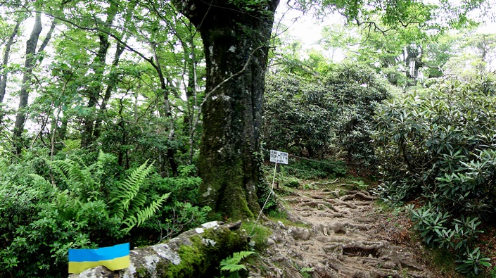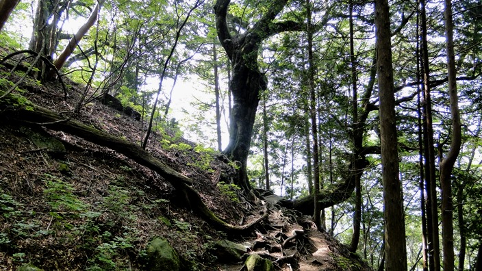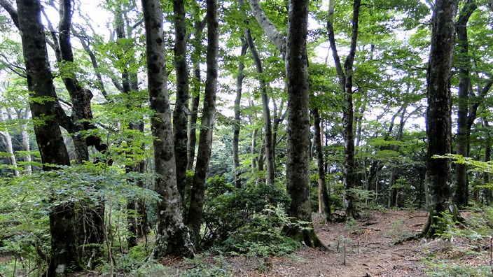 1等三角点がある。 記念撮影してすぐ下山開始。 ![]() ![]() 少し進むと、縦走路分岐がある。ここから右に天城高原ゴルフ場の方へ降りる。縦走路の方面は「八丁池」方面となっている。ブナ林である。 ![]() ブナ林を過ぎると、長い急坂の降りとなる。 ![]() どんどんと追い越されてゆく。年寄りは降りは転びやすくて怖い。 ![]() ![]() 「涸沢分岐点」に出る。坂は終わっているが、岩はごつごつで歩き難い。地理院地図に分岐する道の記入があるが、通る人がいない様で、道は見えない。 もう後ろから誰も降りてこない。一人で原始林みたいな所を、延々と降りてゆく。 ![]() ![]() ようやく「四辻」に戻り着いた。少し前本当に最後の4人が追い越して行った。先着仲間から電話があった。追い越した人が「暗くなってくるからライトを持っているのかな?」と、心配そうに聞いたらしい。四辻まで来れば明るいうちに戻れそうだ。 ![]() 心配そうに二人が待っていた。お待たせしてすみません。 ![]() 計画書より1時間20分遅れの16.50分に到着。駐車場は空っぽ。出発の1時間遅れが最後まで響いた。そうでなければ20分遅れですんだのになー。養老インターでN女史と別れ、小松に着いたのは真夜中の1時を廻っていた。 ■次回登山は、11/21福井「橋立山-文殊山」へ■ 2015年07月28日(火)1回 ゴルフ場より-石楠花コース「天城山」一周 「天城連山」は伊豆半島を走っている。最高峰は「万三郎岳」である。以前に伊豆ドライブをしていて、川端康成の「伊豆の踊子」ゆかりの地の「天城山隧道」に寄った事がある。明治38年に出きたトンネルで、これにより北伊豆と南伊豆と繋がり、天城越えの難所は解決した、と書いてあった。近くに伊豆の踊子の碑もあり、さらに降ると浄蓮の滝があった。トンネルは重要文化財に指定されていた。トンネルの横から「天城山縦走路」が登っていた。ここから天城高原ゴルフ場までを「天城山縦走路」と云うらしい。ここから天城山に登るのかーと、その時思ったものだ。 ![]() ![]() ![]() 百名山を目指している相棒K君が、「天城山」に登っているので話を聞いた事がある。天城高原ゴルフ場から登ったらしく、ゴルフ場にハイカー専用の駐車場があると云っていた。その彼から、一ヶ月ほど前の「万三郎岳」登山の記録を貰った。金沢の仲間と今度は天城峠から万三郎往復したらしい。往復12時間の長丁場だったらしい。相棒は元気だ。これで彼は「天城連山」を全部縦走した事になる。同慶の至り。 ![]() 私の登山は仲間とドライブ旅行兼用。8時間かけて走り、伊豆天城高原のホテルに宿をとって温泉に入って一泊。今朝は7.00時の朝食バイキングを取り、7.50分にホテル出発。天城高原ゴルフ場のハイカー専用駐車場に8.30分到着。舗装してあり凄く広い。100台は留められるようだ。 ![]() この広い駐車場に車が1台だけ停まっている。百名山なので登山者が多いと思っていたので拍子抜け。靴を履きかえて8.40分に出発。道路を挟んだ反対側に登山路の入口がある。バス停もある。いきなり少し降るように歩き出す。 ![]() 今回は万二郎岳から「万三郎岳」に周り、涸沢分岐を通って戻る「シャクナゲコース」の予定。 ![]() 9.00時に「四辻」通過。今は三方に道がある三辻である。万二郎岳の方へ進む。 ![]() 朝、車の中より鹿を見かけた。天城は鹿が居るようで下草が無い。何処でも歩けるので所々にロープが張ってある。全国的に猛暑。雨の心配はないが、風が通らないので蒸し暑い。百名山にしては1400mと標高が低い。熱中症が心配だ。 ![]() 万二郎岳の麓まで平らな道が続く。原生林をさ迷っている雰囲気である。赤い肌の木が目立つようになる。枯れてはいない。葉っぱが青々としている。木肌は「夏椿」に似ている。家に帰って調べたらツバキ科ナツツバキ属の「ヒメシャラ」だった。夏椿と同じく白い名が咲く筈だが、夏なのに花は見付からなかった。 ![]() 急坂をジグザグと登ると、10.15分に「万二郎岳」の頂上に出た。。展望無し。誰も居ない。三角点みたいなものがあるが三角点ではなかった。 ![]() 前方が少し見えた。地図を見るとあのピークを越えて行くらしい。頂上はもっともっと先の方らしい。見えるのは「馬ノ背」と云う尾根らしい。 ![]() 一度降ると平行な道になる。「ヒメシャラ」が多い。太い木は、肌が赤くなる。 ![]() 右手にゴルフ場が見えた。この下から登ってきたのだ。 ![]() 「アセビのトンネル」の標識に出た。堀りさがった道が続きアセビが多いが、花がとっくに終わっていて、アセビの木とは気が付き難い。 ![]() 「石楠立」に出た。「はなだて」と読むようだ。石楠花・シャクナゲから来ているのだろう。ここら辺りから「シャクナゲ」の木が目立つようになる。豆櫻の木もある。万二郎岳を出てから、3人と2人のパーティが追い越して行った。 ![]() 万三郎岳が近ずくと「アマギシャクナゲ」の群落が続く。花の咲く頃は人でいっぱいだと聞いた事がある。大きなブナの木も現れた。 ![](