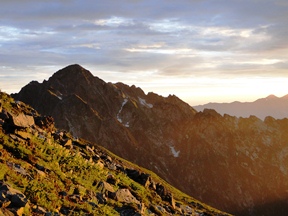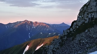 建物の近くに三角点がある。最近三角点の写真を撮っているので記念撮影。この三角点は、3,000mに届いていない。頂上祠がある地点は、3003mと言われているようだ。 雄山を過ぎて別山の方へ縦走に掛かるところで、「内蔵助山荘は雪害のため現在営業を中止中」の立札を見付けた。おいおい、聞いていなかったぞ。情報集めが足りなかったな。宿泊予定の小屋が泊まれなくて、次の小屋まで2時間の余計歩かねばならぬ。さあ大変だ。 ![]() 14.00.大汝山の下の大汝休憩所に到着。私が下の休憩所で一休みしている間に、S女史は立山の最高峰の、大汝山に登りに行った。元気のよい人だ。手を振っている。ここは3015mである。 ![]() 雄山・大汝山・富士ノ折立と三つのピークが並ぶ。富士ノ折立は、ピークは通らずに手前で左斜面を大降りして行く。所がピークに登る人も居るようで、直進する道らしい踏み跡がある。以前入り込み道が無くなり戻った記憶がある。14.25。 左へ大降りすると、その先に真砂岳が見える。その先が別山で、その上に剣岳の頭が覗いている。先は長い。 ![]() 15.20.真砂岳の頂上から富士ノ折立を振り返る。一昨年は、ここから別山を捲く道は通行止めになっていたが、今年は捲き道は通れるようだ。有難い。 ![]() 真ん中に「浄土山」一ノ越へ降りて「雄山」「大汝山」「富士ノ折立」と今日の歩いたコースが全部見える。 ![]() ![]() 捲き道を尾根まで登ると剣岳が大きい。16.40.ようやく「剣御前小屋」に到着。本日は満員と張り紙してある。予約してありますかと聞かれた。なんとか泊めて貰える事になった。部屋が無いので、いつもの休憩場所の大部屋を宿泊部屋にしたようだ。立山でも土日は宿泊予約がいるようだ。 ![]() 18.40.食堂で食事を済ませたら、窓の外が赤くなった。外へ出たら、18.55.日本海に太陽が沈んでいった。 今回の立山で見かけた花々。名前は保障しません。 ![]() ![]() ![]() チングルマ ウサギギク コバイケイソウ ![]() ![]() ![]() イワヒゲ オンタデ ダイモンジソウ ![]() ![]() ![]() ミヤマリンドウ イワオトギリ タカネツメクサ ![]() ![]() ![]() イワギキョウ タカネヤハズハハコ トウヤクリンドウ ![]() ![]() ![]() コバノコゴメグサ イワイチョウ ハクサンイチゲ ![]() ![]() ![]() タカネニガナ イワツメクサ ミヤマキンバイ 第2日目 08月08日(剣御前小屋-別山往復-下山) ![]() 朝起きたら明るい。あわててカメラを提げて外に飛び出す。小屋の前の尾根を少し登る。待つ間もなく5.00時頃、背後の、後立山連峰と別山の間から太陽が昇った。後立山の太陽に近い峰は、数日前に登った「唐松岳」のようだ。白馬三山まで続いている。 立山連峰にも陽が射してきた。富士ノ折立が輝いている。 ![]() ![]() 「剣岳」にも陽が射しているが、こちらから見える部分は影が多い。 ![]() 雄山の稜線に「槍ヶ岳」から「穂高岳」が覗いている。望遠で引っ張ったら、下に一ノ越の山小屋が見える。 「浄土山」の右に、昨日見えなかった「薬師岳」が見える。肩に虹の下だけが見えている。 ![]() ![]() その虹の反対側の下が「大日岳」の右にあった。 ![]() 弥陀ヶ原の上の「鍬崎山」の上に、我が古里の山「白山」が浮かんでいる。 ![]() もう皆小屋に入って朝食のようだ。我々も食事を済ませたら、昨日頂上を踏まなかった「別山」に登る事にする。 少し別山の方へ登りだすと、剣沢の上に「剣岳が」そびえている。 ![]() 昨日泊まる予定だった、内蔵助山荘が見える。修理中らしくヘリコプターが時々飛来する。小屋の上にかすかに「富士山」が見える。 ![]() 別山の頂上はまことに広い。別山のお宮におまいりして、ずーっと伸びている尾根の先まで行く。今年の立山は残雪が多い。 ![]() ここ別山から望む「剣岳」は、一番恰好が良いと思われる。 ![]() 「剣岳」を眺めながら、お湯を沸かしてもらって、モーニングコーヒーを頂く。最高。 ![]() これは別山にある池より、立山雄山を望む。 ![]() ![]() 剣御前小屋に戻り、8.30.預けてあったリュックを担いで下山開始。今回も大日岳へ延びる尾根を降り、新室堂乗越から雷鳥沢に出ることにした。少し遠回りだが、お花畑が続く楽しい道だ。途中お花畑でゆっくりとコーヒーブレイク休憩。 ![]() 10.40.雷鳥沢の橋を渡る。 ![]() 11.00.地獄谷を通過。結構臭いがきつい。半分駆け抜ける。 急坂を登って、ミクリガ池にたどり着く。急に観光客でいっぱいになる。11.40. 左端の「みくりが池温泉」は、2410mで、日本一標高の高い所にある温泉らしい。山小屋ではなくて旅館らしい。 ![]() ミクリガ池の背後の峰々を、今回は、右から左まで全部縦走してきた。室堂バスターミナルまでもうすぐだ。 |