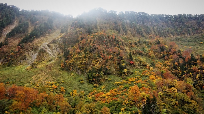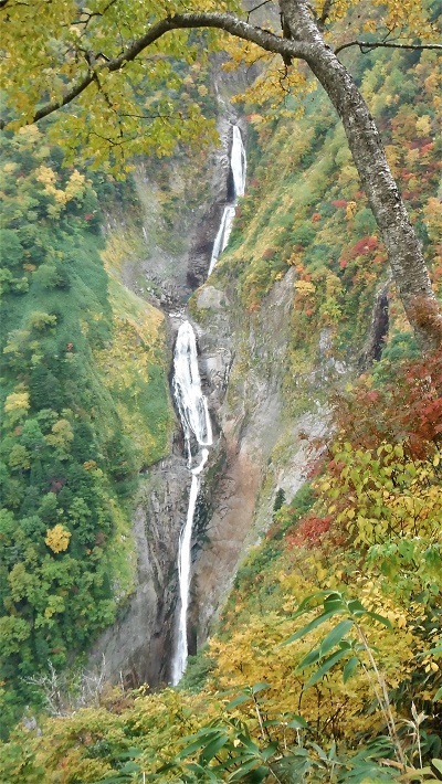 2012年10月17日(水)4回 (弥陀ヶ原-弘法-八郎坂)散策 立山の弥陀ヶ原が、今年の7月3日に「ラムサール条約」に登録されたと報ぜられました。弥陀ヶ原大日平の湿地を、国際的に守って行こう、と云う条約らしいです。 新聞に「立山」の紅葉が載っていました。もう弥陀ヶ原辺りまで下がって来たようです。矢も楯もたまりません。昨日は白山スーパー林道の紅葉狩りで、今日は「立山弥陀ヶ原」の紅葉狩りです。お天気の予報は悪いです。午後から雨、夕方には大雨になるとか。それでも出かけました。立山弥陀ヶ原を散策して、「八郎坂」を、称名の滝を見ながら降りようという計画です。 私が高い山に登ったのは、「立山」が初めてです。高校3年生の時の学校登山で、57年ほど前の事である。その頃は、ケーブルもバスも出来上がっていなかったようで、電車駅から歩いて、登りも降りも八郎坂を使った。標高差600mを一気に登る急坂だ。弥陀ヶ原の追分に山小屋があり、そこが第1日目の泊りだった。2日目は一ノ越小屋、3日目は雷鳥沢に泊まり、4日目は一気に八郎坂を降りて電車駅まで歩いた。 ![]() 本当は八郎坂を登るのが登山だが、この年になると無理は出来ない。八郎坂は下山に使う事にして、登りはケーブルを使用する。S女史を乗せて小松発7.00時。8.40分にアルぺンルート出発点の、立山駅に到着。 ![]() ケーブルカーで美女平まで登る、標高差500mを7分で登る。中々の急坂だ。 ![]() 美女平よりバスに乗換。まだ紅葉していない。杉の大木が多い。 ![]() 滝見台より称名の滝が見える。バス30分乗車で、弥陀ヶ原駅で下車。 ![]() 9.40分。弥陀ヶ原駅付近には、大きなホテルが二つある。弥陀ヶ原ホテルの後ろは、大日岳と右に奥大日岳。 弥陀ヶ原ホテルに向かって歩き、ホテルの左横に、遊歩道の入り口がある。遊歩道外回りを歩く。 木道が続いている弥陀ヶ原を、緩やかに降って歩いてゆく。振り返ると、立山荘が見える。 ![]() 午後から雨が降る予報だが、今は晴れている。それでも雲が出てきて、地上に影の黒い部分が出てきた。手前が「大日岳」、奥が去年登った「奥大日岳」だ。手前は「餓鬼の田」。 ![]() 弥陀ヶ原は緩やかに降っている。富山平野が見える。 ![]() 振り返ると紅葉が綺麗だ。ピークは、天狗平の南に聳える「天狗山」だろう。 ![]() 弥陀ヶ原の先の、三角の山は「大辻山」だ。今年6月に登って、立山の展望に感動したものだ。あそこならば立山が良く見えたはずだ。下の丸い山は「来拝山」だろう。遊歩道突き当りで左に折れる。右は天狗平に登って行く道だ。 ![]() 10.25分、バス道路を横断する。遊歩道外回りは、手前でここから出発点へ戻って行く。我々二人はバス道路を横断して、バス道路沿いの、弘法バス停の方へさらに降りてゆく。ここから先は余り誰も歩かないようで、誰とも出会わなくなる。左前に「鍬崎山」が大きくそびえている。こんな大きな山だったのだ。 ![]() 左を振り返ると「薬師岳」が大きくそびえている。天気はどんどん悪くなってくる。 ![]() 並行するバス道路が、七曲りに差し掛かると、紅葉する木が多くなってくる。時々バスが通って行く。 ![]() 11.30分、バス道路に出て、弘法バス停に着いた。実はここで雨が降っていたら、ここからバスに乗って帰るつもりだった。八郎坂は苔むした急坂で、雨が降ると滑って怖そうだ。所がまだ雨は降りださない。まだしばらく大丈夫みたいだ。バス亭通過、その少し先にトイレのある広場がある。そこでバス道路を横断して、向かい側の遊歩道に入る。大日平が見える。 ![]() ここから15分ほど遊歩道を降ると、「八郎坂下山口・標高1580m」の標識のある分岐に出た。右に降りてゆく。直進すると、美女平まで歩く道があるようだ。八郎坂の方へ降りると、木道は無くなる。 ![]() いきなり急坂になる訳でなく、初めは斜めに緩やかに、斜面を降りてゆくが、やがてジグザグの岩の道になる。急斜面に付いているので、怖い所もある。木が茂っていて思ったほど滝は見えない。時々開けた所がある。降りてしばらくの地点、一段と三段の滝が見える。 ![]() 上の滝見台。滝の上部のVカットが見えてきた。 ![]() ![]() 四段の滝の全部が見えてくる。しかし上段の滝は、壁の途中から噴き出しているように見える。 とうとう小雨が降り出した。 ![]() 下の滝見台。ここまで降りてくると、Vカットが全部見える。陽が差していたら、余程紅葉が映えているだろうにー。曇りで小雨で残念。 ![]() ![]() 14.00時、ようやく坂を降り切る。慎重に滑らぬよう、ひざを痛めぬよう、ゆっくりと降りたので、2時間以上掛かっている。途中で若者が一人登ってきた。これが登山中に遇ったただ一人の登山者である。しかもこの登山者は、また上から下りて来て、追い越して行った。トレーニングにでもするつもりで上下しているのだろうか。 橋を渡って車道を歩いて滝の展望台へあがる。対岸へ渡る橋の上だけが、滝壺が見える。橋の上までしぶきが飛んでくる。も