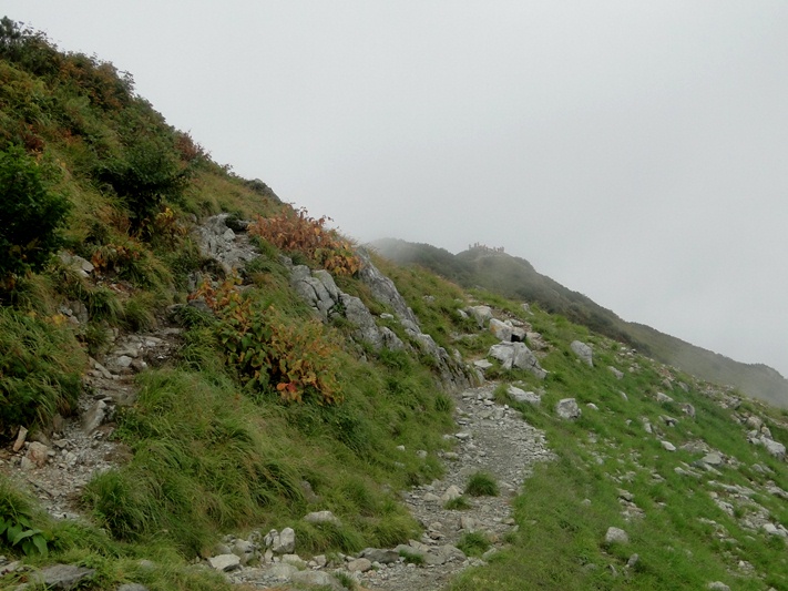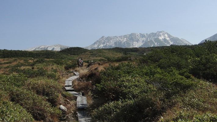 2011年09月17-18日(土・日)3回 (奥大日岳・雄山) 第一日目 9月17日(雷鳥沢-奥大日岳往復-ロッジ立山連峰) 今年の8月は夏山三昧の予定だったが、ひょんな事で全部ご破算になった。ようやく落ち着いたので立山を歩いてくる事にした。台風が近づいているので天気が悪い。両日とも雨マークが出ている。もし雨だったら、山小屋に泊まって戻って来ようと、温泉のある山小屋を見付けたので予約する。今回は「奥大日岳」に登ろうと思った。去年、立山の剣御前小屋より、奥大日岳を眺めながら新室堂乗越経由で下山した。奥大日岳はカッコよく、登り易そうに見えた。 ![]() 土砂降りの雨の中、朝5.30分に家を出て、立山インター降車でケーブル駅に7.10に着く。7.20分のケーブルに乗る。小雨だが登山客でいっぱいだ。美女平でバスに乗り換え8.40分に室堂駅に着いた。小雨なので登山者は全員雨具を付けている。小雨なのに見通しが利く。今日登る予定の奥大日岳も見える。秋の気配がする。 ![]() 遊歩道をみくりが池の方へ進む。池の向こうの立山雄山は、良く見えるが、頂上には雲が掛かっている。 ![]() 池より地獄谷の方へ降りる。地獄谷の上にそびえているのが、奥大日岳である。 ![]() 地獄谷を鼻を押さえて通り過ぎると、今日の宿泊予定の「雷鳥沢・ロッジ立山連峰」の前を通る。ここから雷鳥沢のキャンプ場を通ぬける。 ![]() 「アキノキリンソウ」かな。 ![]() この菊の名前は判らない。「ヤマシロギク」かな。 キャンプ場を通り抜け、橋の架かった川を渡る。左に折れ、新室堂乗越を目指す。 乗越が近づいてくると、背後に地獄谷が広がってくる。一番下の小屋が宿泊予定の「ロッジ立山連峰」。その上が「雷鳥沢ヒュッテ」。さらにその上が「雷鳥荘」。その上がバスの終点「ホテル立山」である。 ![]() 10.10分。新室堂乗越は尾根の上で、右が剣岳方面で、左が大日岳方面である。左に折れ、水平道を室堂乗越まで来ると、剣岳がが顔を出してくる。早月尾根が伸びている。その向こうは毛勝山だろう。 ![]() 行く先に奥大日岳が見えるが、幾つもピークを越えて行くようだ。それにしてもどれが頂上か判らない。 ![]() ![]() 「オヤマリンドウ」がある。花は全部閉じている。 ![]() 「シラタマノキ」の実がなっている。白いのもあるがピンクの物もある。 奥大日岳の方へ回り込んでくると、剣岳がますます現われてくる。こちらから見る剣岳は、立山別山より見るより剣岳より、尖って見える。合羽を脱ぐ。 ![]() 若い頃一度だけ、この剣岳の頂上を登っている。右下のピークは前剣だろう。左の長い早月尾根の下の方に早月小屋が見えた。 ![]() 剣岳の反対側に、弥陀ヶ原が広がっている。バスが登ってくるのが見える。深い称名川の谷が見える。この先で称名滝になって落ちているのだろう。 ![]() なかなか頂上に着かない。室堂の方から見ると尖って見えるが、登ってみると横に長い山だ。ようやく前方に人が集まっている小さな瘤が見えてきた。あれが頂上らしい。残念ながらモタモタしていたら、ガスがかかって来てしまった。 ![]() ![]() 12.10分、奥大日岳の頂上到着。霧雨で何も見えない。残念。おまけに雨までが強くなった。あわてて合羽を着る。4.5人いた登山者も降りて行った。誰も居なくなった。私もそこそこにして下山開始。 ![]() 「カライトソウ」が残っている。 ![]() 「ナナカマド」に赤い実がいっぱい付いている。小雨は止まないが、霧が晴れてきて、稜線が見えてきた。気温は、下界は30度超えらしく、山でもあまり寒くないのでありがたい。 ![]() 前方から登ってきたアベックが、足を止めて何かを見ている。登山路を雷鳥を横切っている。3羽居ると指を出して教えてくれたが、また1羽現われて4羽になった。まだ色が黒い。3羽は斜面を降りてゆき、一羽は戻って斜面を上がって行った。 全羽同じ大きさだが、3羽は子供で、1羽は親らしい。 ![]() ![]() 15.00分、予約してあったロッジ立山連峰に到着。連休なので混んでいるのかと思ったが、客は30人位でガラガラ。混雑期が済んだので、小屋改装中で周りは少し雑然としている。単独登山者は私一人らしい。二段ベットが6ッツ入った12人部屋に、私一人だった。 ![]() この山小屋に温泉浴場がある。大きな展望風呂で、登ってきた奥大日岳が見の前に見える。温泉は透明、そのままの温度らしい。ボイラーが無いので水を入れ過ぎないよう、と張り紙がしてある。24時間入れる。食事前と寝る前の2回入浴。まったく、いい湯だな。携帯が通じる。一人で寂しいので、あちこちメールをする。 第2日目 9月18日(雷鳥沢-一ノ越-雄山往復-下山) ![]() 朝6時食事。予報では、昨日より今日の方が雨の降る率が高かったのに、良く晴れている。テレビでは降水確率10%と云っている。儲けものだ。雨が降っていたら、朝風呂でも入ってすぐ下山しようかな、と考えていたのに・・・。食堂からは立山が正面に見える。7.05分立山頂上に向けて出発。 ![]() 昨日と同じくキャンプ場を抜け