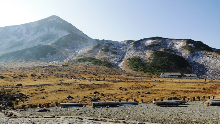 2013年10月14日(月祝)7回 室堂-天狗平-弥陀ヶ原散策 去年の秋に「弥陀ヶ原散策」として、弥陀ヶ原バス停より歩いて、弘法から八郎坂を降りた。とても良かったので今年は、室堂ターミナルより歩いて、天狗平山荘経由、獅子ヶ鼻岩-追分-松尾峠展望台まで行き、弥陀ヶ原バス停から帰る予定。去年と同じ時期なので紅葉も楽しめると考えていたのだが。 ![]() 今日は連休最終日。昨日までは台風で雨が降っていたが今日は晴れた。5.00時前に家を出てケーブル乗り場に着いたが、駐車場は満杯。一番遠い所に車を置く。6.00時より10分おきのピストン輸送で、6.50分に乗る。8.00時に室堂到着。先ずみくりが池を写す。 ![]() 振り返ると浄土山辺りが白い。昨日雪が降ったらしい。日陰に少し雪が残る。水たまりに氷が張っている所もある。 ![]() 帰った後で調べたのだが、昨日が立山初冠雪で室堂付近で1センチの積雪があったらしい。バスターミナルとみくりが池の間から、下に見える天狗平の「立山高原ホテル」と「天狗平山荘」に向かってのんびりと降りてゆく。天狗平の向こうに「富山平野」が広がり「能登半島」が見える。 ![]() 右手が大日連峰。手前が「奥大日岳」で向こうが「大日岳」。奥大日岳は手前のピークが最高地点であるが、稜線の真ん中の小さいピークに三角点が在るので、そこが頂上になっている。最高地点より5m程低い。 ![]() 剣御前に隠れていた「剣岳」が段々と大きく姿を現す。手前の斜面の水平歩道は地獄谷に至るものだが、通行止めになっていた。剣岳は天狗平を過ぎると、奥大日岳に隠れてしまう。 ![]() 9.10分にバス道を横切って天狗山荘に到着。トイレを借りる。ここからは「弥陀ヶ原バス停」まで直接降りる道もあるが、遊歩道は「獅子ヶ鼻岩」を経由している。ナナカマドの赤い実の向こうが奥大日岳である。もう一度バス道を横切り弥陀ヶ原へ降りてゆく。 ![]() 大日連峰全景。木道になっているので歩きやすい。 ![]() 振り返ると天狗平の上に「立山主峰」が頭を出している。登山客は皆んな頂上を目指して、弥陀ヶ原を歩く人は居ないと思っていたが、結構登山客とすれ違う。追い越してゆく人は、一気に八郎坂を降りて称名滝を目指す人が多い。皆さん元気だなー。 ![]() 実に気持ちの良い、池塘が広がる弥陀ヶ原である。「鍬崎山」を目指してのんびりと降って行く。ベンチでのんびりと食事をしていたら、下から登ってきた人がベンチで休ませてと云って「大変だった―」と云った。この先凄い難所があるらしい。見た感じでは草原が続くが、この先で深くえぐられた川を渡るらしい。 ![]() ![]() 11.25分、なるほど突然に大きな谷のふちに出た。初めは大したことは無かったが、 ![]() やがて急勾配になり、垂直かと思われるほどの岩場に出た。太い真新しい鎖が下がっている。足場が見えなくて心細い。結構長い。 谷底へおりて振り向いたら、降りて来た上に大きな岩が聳えていた。あれが「獅子ヶ鼻岩」らしい。今まで気が付かなかった。谷底は思ったより水が少ない。 ![]() 今度はまた弥陀ヶ原まで登り返す。12.10分。また大日岳が見えてくる。少し紅葉している。去年はもっと綺麗だったような気がする。 ![]() 富山平野がまだ見える。一番先は「大辻山」らしい。この辺りに池塘が多い。 ![]() ![]() 12.45分、弥陀ヶ原バス停より下の「追分」に出た。バス道を横切り今日は向うに見える「松尾峠展望台」まで往復するつもり。去年はここより「弘法」の方へ降りて行った。私が高校3年の時、生まれて初めて登山を経験した。その時初めて学校登山で立山に登った頃、バス道路を建設中で、八郎坂を歩いて登りここ追分の「追分小屋」に一泊目の宿を取った記憶がある。今は何もない。昔の写真を引っ張り出してきた。これが追分小屋である。二日目の「一ノ越山荘」へ向かう所だ。1955年と有るから58年も昔の事だ。 松尾峠は目の前の小山らしい。昔はここ追分から松尾峠を越え、立山カルデラの底に有った「立山温泉」を過ぎ、ザラ峠を越え、さらに針の木峠を越えて信濃に出る道があったらしい。佐々成政が雪中に通った話は有名である。 ![]() ![]() 実は私もザラ峠から松尾峠まで歩いた事がある。1963年とあるから結婚して3年後位か。亡くなった妻と二人で一ノ越から「五色ヶ原」まで行き、ザラ峠からカルデラを降り、また松尾峠まで登り返し、弥陀ヶ原でテントを張り、翌日に八郎坂を降り、粟巣野の電車駅まで歩いた記憶がある。だいぶ強行軍で彼女はへたばったし、そのあと子供が出来て育児に専念し、二人で山に入る機会は無くなっていった。 昔の写真を探していたら、上の写真とまったく同じ地形の写真が出てきた。五色ヶ原から松尾峠を越えてここまでたどり着いた。彼女は笑っている。50年前の写真だ。 ![]() 13.25分に「松尾峠」に着いた。三角点が在った。