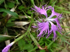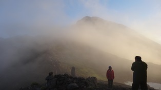 ![]() 小屋は予約してないので満員で入れないかも知れない、と思っていたのに、宿泊者は我々を含めて8人しか居ない。早い食事を済ませていたら、霧が晴れかかったので頂上に登ったが、上に月が見え、西のほうが夕日で赤くなったが、とうとう霧は晴れなかった。明日は期待できるかな。 第二日目 8月01日(賽の河原-三ノ池周回-女人堂-ロープウエィ) ![]() 8/01日、朝起きたら濃い霧、小雨。がっくり。5.30.朝食。6.30分.小屋出発。登ってきた道を少し下って二ノ池小屋のほうへ降りてゆく。二ノ池があるのが微かに判る。高山植物が咲いているのだが、雨に濡れて寒そうだ。これは「ミヤマダイコンソウ」かな。カメラも濡れてレンズの中が曇ってしまった。乾かさないと写真が撮れない。 ![]() 濃霧で方向が判らない。二ノ池本館から、新館を通らずに近道したら、合流点でウロウロする。賽の河原を通る。20年前は、白装束の信者多数が、ここで祝詞をあげていたのが印象的だった。 ![]() 8.40分.五ノ池小屋に到着。昔と全然違うようだ。「コマクサの群生地あります」の張り札がある。小屋の後ろの「飛騨頂上」の神社の前で休憩。段々霧が晴れてきた。 ![]() コマクサ案内に従うが見つからない。小屋へ戻って場所を聞く。もっと先だった。 ![]() 尾根の上のガラガラ道を行くと、斜面にコマクサが見えてきた。ロープが張ってあり傍まで行けない。結構咲いている。 ![]() 30分以上遊んで、三ノ池を回って下山にかかる。雨も止んだ。周回コースは高山植物が多い。宗教色も無く雰囲気が良い。 ![]() 「ハクサンイチゲ」。小さな地面を這うようなシャクナゲもある。池が姿を見せ始めた。 ![]() ここにも「コマクサ」があった。子供連れの雷鳥も見かけた。写真はブレていて載せられない。 ![]() 池を一回りして、10.05分.三ノ池避難小屋に到着。開田高原からと、女人堂からの道が登ってきている。この池の水は御神水なのだそうで、女人堂から登ってきた信者が水を汲んですぐ下りて行った。我々は小屋の中でお湯を沸かして抹茶を頂く。45分間休憩。 ![]() 10.50分.女人堂に向けて下山開始。この下山路が考えていた以上に道が悪い、山の斜面に付いた道を降りてゆく。雨の後で滑りやすい。おまけに又雨が降ってきた。今度は雷が鳴り出した。尾根の上でなくてよかった。急な階段がある。急斜面の雪渓をトラバースする。緊張する。花は咲いているが雨に濡れて撮れない。12.30.女人堂に到着。 ![]() 今日は土曜日で団体の信者講の登山があるようで、雨具を着けた人で、小屋の中も外も人でごったがえしている。休むどころでない。 「ゴゼンタチバナ」 相変わらず雷鳴がする。13.30分.ゴンドラ駅に到着。所が、雷でゴンドラが運転見合わせ中。大変だ。雷が止まないと帰れない。一時間半待ちの人も居るようだ。ずぶぬれの合羽の始末と着替えをゆっくりとしていたら、20分ほどでゴンドラが動き出した。 14.05分.車に到着。近くの「木曽温泉」で入浴。15.20分.元来た道を走り、金沢の相棒宅18.40分.自宅着19.15分。 御嶽で見かけた花・名前は間違えているかも知れない。 ![]() ![]() ![]() クモマグサ イワカガミ ミネズオウ ![]() ![]() ![]() ヒメシャクナゲ ヨツバシオガマ ![]() ![]() ![]() キキョウ ハクサンイチゲ コマクサ ![]() ![]() ![]() コバイケイソウ オンタデ ゴゼンタチバナ ![]() ![]() コケモモ ツマトリソウ![]() ![]() モミジカラマツ コマクサ![]() 前回御嶽山に登った写真が出てきたので載せる。1990.08.04.と日付が入っている。19年前だ。飛騨頂上付近だと思われる。向こうの大きい山は「乗鞍岳」だ。その向こうは北アルプスの槍・穂高である。アップにすると槍がはっきりと見て取れた。快晴だ。こんな展望を期待して登ったのに、今年の御岳は濃霧と雷だった。 今度は、向こうに見えるあの「乗鞍岳」に登りに行く。 |