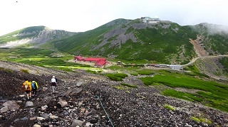 ![]() ![]() ![]() 宿泊隣室のさいたま市のご夫婦。ベテランらしい。霧が晴れないので15分くらいで下山開始。 ![]() 振り返ると頂上がかすかに見えた。 ![]() 小さな草までも紅葉するのだ。 ![]() ![]() 10.35分に肩の小屋に戻り着く。テラスの広場の机で埼玉のご夫婦とコーヒータイム。登山者がどんどんと登ってくる。 ![]() 下山開始。帰りは相変わらず霧が濃いので、富士見岳には登らず通過。林道と別れて高山植物園の方へ降りる。高山植物も紅葉している。 ![]() ![]() ![]() 11.40分に畳平に登り着く。埼玉のご夫婦とお別れ。二人は乗鞍高原の方へ降りて、松本から電車で帰るらしい。我々は、車を留めてある「ほおのき平駐車場」へ降りる。 ![]() 下界は晴れていた。猛暑が戻りかけ、山での寒さが嘘みたいだ。 ![]() 平湯温泉バスターミナル隣の「ひらゆの森」で、露天風呂に入って帰る。 肩の小屋に貼ってあった乗鞍岳のポスターに、乗鞍 岳にあるピークの名前が載っていた。 剣ヶ峰・蚕玉岳・摩利支天岳・富士見岳・大黒岳・魔王岳・と登っているが、あとは登山路が無いピークが多いようだ。それでもまだ登れるピークがあるなー。 ■次回登山は、福井県「銀杏峰」へ■ 2018年08月26日(日)5回 大黒岳-富士見岳-摩利支天岳 今年は異常気象。台風が次から次へと押し寄せる。相変わらず暑い暑い。土日は空いていたが、天気予報を見て、今日の日曜日に「乗鞍岳」に遊ぶことにした。毎日クーラー漬けで、しばらく歩いていない。体力に自信が無いので、乗鞍岳でも最高地点の剣ヶ峰を狙わず、未だ登っていない「大黒岳」や「摩利支天岳」のピークでも歩いて来ようと、暢気なものである。 4.20分頃に家を出て、高速を富山ICで降り国道41号を走る。本当は、東海北陸道を走り高山市を抜けた方が早いが、今回は神岡から平湯温泉を抜けて「ほおのき平駐車場」に出た。高速部分が短いが、早朝で車が少なく結構早く着いた。7.10分到着。東海北陸道は、長いトンネルが続くので、なるべく走りたくない。今年は免許書き換えで、先ほど認知症検査の為、自動車学校で試験を受けた。無事通過だったぞ。![]() ほおのき平駐車場、ここは無料駐車場で有難い。一時間に2本の7.25分のバスに乗れた。45分位で畳平まで登るらしい。途中は霧の中を走り、やはり山は天気が悪いなーと思っていたら、段々と晴れてきた。畳平に8.15分到着。 ![]() バスを降りたら晴れていた。所が風が強く吹いていて、寒くてびっくりする。慌ててリュックから防寒具を探すが何もない。長袖のアンダーシャツ上に直接チョッキを着てきた。上着を入れたはずだが、車のカバンに置いて来らしい。薄いヤッケが入っていたので着こむ。それにしても風が強い。寒い。ビックリだ。 広い駐車場を行くと、左が「富士見岳」。遠くが「摩利支天岳」でドームが見える。 ![]() 駐車場の端が「鶴ヶ池」。その向こうが「大黒岳」である。右へ回って今から登りに行く。頂上の左の方に、建物みたいなものが見える。地図を見ると駐車場の反対側の山が「恵比寿岳」になっている。駐車場を挟んで、恵比寿・大黒と一対になっているようだ。恵比寿岳には登山路が無い。 ![]() ![]() 「大黒岳」と「富士見岳」の間の峠には、乗鞍高原からの舗装道路が登ってきていて、岐阜と長野の県境になっている。8.35分。今日は長野県側のスカイラインが、「マウンテンサイクリングin乗鞍」という競技があるようで、マウンテンバイクの選手が、下から登ってきている。調べてみたら、標高差1260mの差を、乗鞍高原から畳平まで登る競技である。チャンピオンは1時間位で登るようで、7時出発なので、選手たちは続々と到着のようである。 ![]() その間を抜けて、道路を横断して向かい側の「大黒岳」に登り出す。登山口の看板には「20分」と書いてある。「熊出没注意」とも書いてある。 ![]() 遠く山並みが見える。何処だろう?。8.50分頃に頂上到着。風除けのセメントづくりの避難所がある。方位版があり照らし合わせる。 真ん中の尖った山は「甲斐駒ヶ岳」か「八ヶ岳」か。情けない。区別がつかない。方位版には甲斐駒岳の右に富士山の記入があるが、富士は見えないな。北アルプスが近くて見えるはずだが、今日は雲に覆われている。 ![]() 風が強いので、避難所に入って休んでいたら、あっという間に霧に包まれた。日本海側からガスが起こりどんどん押し寄せる。今日は段々と天気が良くなる予報のはずだがー。 ![]() 登って来た登山者が、方位版で風を避けている。40分か50分も休んでいたら、ようやく霧が晴れてきた。避暑のつもりで歩きに来たのは的中、まことに寒くて震えていた。 ![]() ![]() ![]() 9.50分頃下山開始、霧が晴れたら畳平が物凄い事になっていた。 ![]() 続々登ってくる自転車選手。ゴールした選手は競技が終わるまで降りることが出来ないので、道半分で競技が終わるのを待っているようだ。11.30分に競技終了、12.30分に交通規制解除との事らしい。 ![]() ![]() 10.15分に峠ま