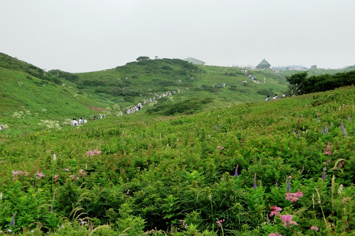 頂上は小屋の前から登り、鳥居をくぐって降りる一方通行になっている。鳥居をくぐる道は風が当たる方なので、風を避けて小屋の方へ降り始めた。この悪天候では登ってくる人は居ないだろうと考えていたら、大団体が登ってきた。中学生の学校登山らしい。来るは来るは200名以上は居るようだ。上り優先で待って居ると何時まで経っても降りられない。おまけに狭い頂上が満員なのか渋滞になってきた。隙間を見て「蚕玉岳」まで戻りやり過ごす。生徒たちは頂上を周って続々と降りてゆく。 ![]() ![]() 行列の間に紛れ込み、肩の小屋でまた一休み。昼食を取る。今度は富士見岳に横路登山。誰一人いない。 富士見岳を横断して林道に戻り着いたが、濃霧のためヘアピンカーブを曲がり損ねて、何の気なしに歩いていると前方から何人も歩いてくる。良く考えたら自分がまた反対に登る道を歩いている事に気付き苦笑。 バスターミナルにリュックを置いて、お花畑の散策路を一回りする。木道が設置されていて歩きやすい。登山路と散策路で見掛けた花をまとめて載せておく。 ![]() ![]() ![]() トウヤクリンドウ コマクサ オンタデ ![]() ![]() ![]() チングルマの実 イワギキョウ イワツメクサ ![]() ![]() ![]() イワオトギリ コウメバチソウ ウサギキク ![]() ![]() ![]() ミヤマセンコ コバイケイソウ ヨツバシオガマ お花畑には思ったより花が残っていた。 ![]() 14.15分のバスに乗り、朴の木平バス停に15.05分に着いた。高山から国道41号線をのんびりと戻った。なんだかラーメンが無性に食べたくなり、富山で食べて高速に乗って帰った。 **次回登山は、8/25-26長野県「御嶽山」へ** 2009年08月04日( )1回目 蚕玉岳-剣ヶ峰-富士見岳 いつだったか「乗鞍岳」に登りに行った事がある。畳平まで車が入れた頃だ。遅くから出かけて、その日は肩の小屋に泊まった。朝起きたら雨が降っていた。それでも登った。頂上の祠まで行ってすぐ戻った。雨と霧で何も見えなかった。どうゆう山なのが全然判らなかった。 今年の夏も天候不順である。それでも3000m級の山に登るのは今しかない。日帰りでS女史と出かける。高速を富山で降り、国道41号を走り神岡から平湯に向かう。平湯温泉からシャトルバスに乗り換えなくてはならない。 ![]() バスセンターまで行ったら、ここには駐車出来ない。「あかんだな駐車場」へ入れろと言う。だいぶ離れた駐車場まで行ったら、時間的にここからの出発は不便だ。「ほおのき平の駐車場」に行けば駐車料金は無料だし、時間的にも便利だと言う。又戻って今度は平湯峠まで登り、高山の方へ降りたところにあるバスセンターまで行く。旨い具合にすぐバスが出た。9.40.に乗鞍畳平の駐車場に着いた。 ![]() トイレを済ませて、御内板でコースを確認して歩き出す。まず大きな建物の後ろに広がるお花畑にに降りてゆく。すぐ「クロユリ」がお出迎え。数も多い。 ![]() 「ハクサンイチゲ」の群落もある。 ![]() 「コバイケイソウ」も咲いている。お花畑の中に木道の遊歩道が造られている。観光客がいっぱい歩いている。 ![]() バス停より降りてきて、遊歩道の方へは周らず、直進して広い林道に合流してしばらく歩く。 ![]() 「アオノツガザクラ」がかわいい。 右に「不動岳」と「不消ヶ池」がある。池に雪渓が掛かっているが溶けていない。よほど水は冷たいのだろう。 ![]() ![]() 「シナノキンバイ」 ![]() 左の「富士見岳」の裾の斜面に「コマクサ」が咲いている。 ![]() 右に「コロナ観測所」の道を見送ったら、前方に大きなピークが見えてきた。どうもあれが最高峰の「剣ヶ峰」らしい。思ったより高そうだ。 ![]() 前方に小屋が見えてきた。「肩の小屋」だ。以前泊まったのはこの小屋なのか。10.30.小屋でトイレを借りる。有料になっている。小屋の裏が広場になっており大勢の人が休んで居る。見えるピークは、手前が「朝日岳」。向こうが「蚕玉岳」れ。「剣ヶ峰」は雲の中らしい。 ![]() 「ウサギキク」 ![]() 「ヨツバシオガマ」。高山植物が多く咲いているのでうれしい。 ![]() ここから岩場の本格的な登山路となる。中学生くらいの生徒の集団が下山してくる。 ![]() 「蚕玉岳」に到着。もうひと登りで頂上だ。頂上の社が見える。 「蚕玉岳」の西側に大きな池があった。「権現池」らしい。 ![]() ![]() 剣ヶ峰に登りかかると、道が二つに分かれ、登りと下りと専用になる。左を登ってゆくと小さな「頂上小屋」の前を通り、社の後ろに着いた。表に回り乗鞍本宮にお参り。11.35. 振り返ると、登ってきた道が全部見える。頂上小屋もコロナ観測所も見える。 ![]() ![]() 剣ヶ峰と言うだけあって狭い。座ってお弁当を食べる場所がない。記念撮影して下山開始。途中の岩場で食事をしている人が多い。 我々も「蚕玉岳」まで戻り食事をする。先頃まで居た頂上が見える。その先のピークは「大日岳」らしい。 ![]() ![]() 東に「乗鞍高原」が少し見える。その上には北アルプスが見えるはずだが、無理は言わない。天気の悪いこの夏