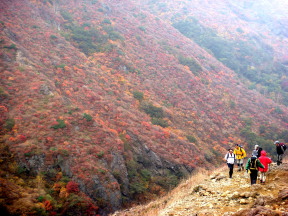 2009年10月17日 初登山 K君と2山巡り@那須岳 相棒K君は「日本百名山」を目指している。今夏には、岩木山、八甲田山、八幡平、早池峰山と四山を歩いた。今年第2弾の百名山は、二日間で那須岳と吾妻山を二山歩こうと云うもの。百名山「那須岳」は、那須五岳と呼ばれる、茶臼岳、朝日岳、三本槍岳、南月山、黒尾谷岳を総称するらしい。今回は「茶臼岳」だけを登る計画。本当は五山全部を登らないと、那須岳を登った事に成らぬかも知れないが、今回はここだけ登って那須岳踏破と云う事にする。 ![]() 高速を自動車で飛ばして、白川インターで降り、那須ロープウェーを目指す。10.40分にケーブル乗り場に到着。11.10分、ロープウエーの山頂駅に到着。辺りは霧で真っ白。ほとんど景色は何も見えない。 ![]() 茶臼岳に登る人が大勢いる。観光客でも登るようだ。 ![]() 岩がゴロゴロしていて、いかにも火山の跡みたいだ。 ![]() 鳥居をくぐる。火口を一周する道に入る。三角点が在る筈だが、最高地点にないので、通り過ぎてしまった。 ![]() 地図に1915mと云う記入のある最高地点で記念撮影。12.00分。 ![]() 晴れていれば余程景色が良さそうだが、残念。 ![]() 火山特有の不思議な景観だ。 ![]() 13.00時、峰の茶屋跡避難小屋を通過。 ![]() 直進すれば、那須五岳の縦走路だが、残念ながらここから下山。紅葉が綺麗、少し見えた。 ![]() 13.40分ローブウェイの山麓駅に到着。 ![]() 那須湯元温泉の「温泉神社」に参る。芭蕉も訪れ、那須与一が祈願した神社である。 ![]() 神社の裏を降りてゆくと、地獄がある。「殺生石」がある。この殺生石は「謡曲・殺生石」に、なっている。 ![]() 石仏が並んでいる所もある。 ![]() 一日目の泊りは、裏磐梯高原のペンションである。ネットで予約しておいた。 吾妻山へ続く。下記・初登山の稿へ。 |