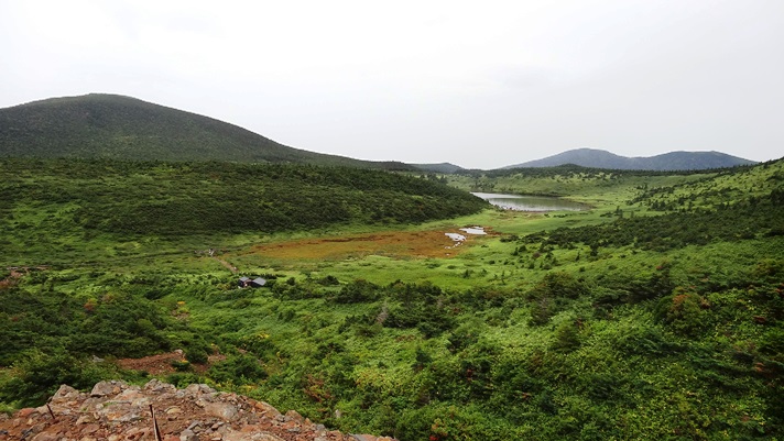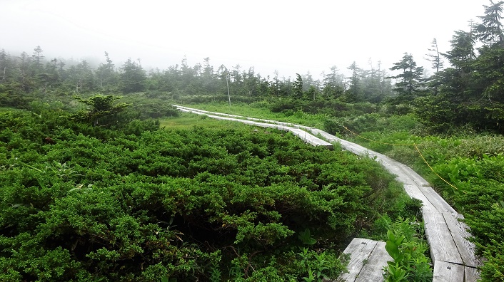 2017年07月31日(月)3回 女性コンビと2山巡A西吾妻山 昨日は「月山」に登った。そのあと山形自動車道を走って、米沢市近くの「小野川温泉」に泊まった。足が遅くて月山にてこずって、小野川温泉に着いたのは夜8時だった。もっともこんな事態も予想していたので、素泊まりで予約してあったので、無事宿泊、温泉にも入った。 今日は前回と同じく、天元台ロープウェーに乗って「西吾妻山」に、二人を案内する予定。天気は思わしくない。ロープウェー出発に合わせて、6.30頃、宿を清算して出発。米沢市郊外のコンビニで食料調達。裏磐梯に抜ける県道2号を登って行く。7.30分頃に白布温泉の「天元台高原ロープウェー・湯元駅」に到着。無料駐車場にはまだ車が少ない。 ![]() 始発は8.20分らしい。ロープウェーとリフト3本を乗り継ぐ。往復切符を購入。3.500円。予想に反して人が少ない。 ![]() まずロープウェー。標高差430m登り、1.350mの高原駅に到着。 ![]() スキー場として開発された天元台高原に到着。しばらく高原を歩いて、リフト乗り場へ。「しらかばリフト」で1.450mへ。2本目の「しゃくなげリフト」で1.590mへ。 ![]() 3本目の「つがもりリフト」で1820mへ。辺りはツガの森となってくる。終点近くなったら、霧の中に入り何も見えなくなった。 ![]() ![]() 9時過ぎに終点に着いた。「五名峰展望台」があるようだが霧の中だ。五名峰とは「飯豊・朝日・月山・鳥海・蔵王」の、日本百名山の五座らしい。見えたら良かったのになー。 ![]() 前回は人形岩の方へ登ったが、今回はカモシカ展望台の方へ登る。霧雨。 ![]() 9.45分に「かもしか展望台」らしき所を通過。「飯豊・朝日・月山」の眺望良し、と書いてある すぐ尾根の上まで登り、木道の登山路となる。段々と下がり、人形岩への道の途中から、右に分岐を降って「大凹」という池塘のある開けた場所を通る。 ![]() ![]() ![]() モミジカラマツ イワイチョウ オオバキスミレ ![]() 10.10分、大凹の終わりに「水場」がある。ここから急坂となる。登り切り少し歩くと岩ゴロゴロの広場に出る。梵天岩から天狗岩に続く岩の広場である。11.05分に到着。 ![]() 天狗岩の近くから一度降って「西吾妻山」に登り出す。 ![]() ![]() 11.40分に「西吾妻山」の頂上にたどり着いた。二人がお菓子を食べながら待ちわびていた。遅れてすみません。トガの森の中で展望なし。 ![]() お菓子を頬張って記念撮影をして、避難小屋まで行って昼食と決定。 ![]() 12.05分に避難小屋到着。誰も居ない。 ![]() 昼食。途中に男性二人入ってきたが、二階へあがって行った。大きな小屋である。 ゆっりとして居られない。30分ほどで天狗岩の方へ下山開始 ![]() ![]() 木道で大きなホシガラスが、餌みたいなものをつついていた。人なっこい鳥の様で、しばらく眺めていても逃げなかった。 木道の庭園みたいな登山路を行く ![]() 前方に旗がなびく祠が見えてきた。天狗岩の岩場らしい。祠は吾妻神社。 ![]() ![]() 梵天岩の方へ進み、ここで初めて「西吾妻山」が姿を現した。 ![]() 梵天岩の先から、大凹の池塘を撮ろうと、岩山の先へ進む。 ![]() 眼下の木道を、早くも仲間二人が歩いてゆく。下山しようとしたが、下山口の取っ掛かりが見当たらず、しばらくうろうろする。岩の原は、何処でも歩けるから具合が悪い。単独登山者の頭が向こうの方に見えてホッとする。 ![]() ワタスゲ咲く池塘。 ![]() ![]() 大凹を過ぎて分岐を、人形岩の方へ進まず、登って来たカモシカ展望台経由で降りる。先の二人は人形岩経由で下山して、リフト乗り場で待ちわびていた。15.10時頃。リフトの先の方が晴れてきた。向かいに朝日岳が見えるはずだが―。 ![]() 15.55分ロープウェーの高原駅に到着。20分置きにロープウェー出発。 ![]() 16.15車で着替え。少し下がった所の、日帰り温泉で入浴。ちょっとゆっくりしすぎた。磐梯高原へ降り、桧原湖の湖畔を通り、猪苗代磐梯高原ICより「磐越自動車道」にのり、「北陸自動車道」をひたすらに走る。今日中に戻れるつもりが、真夜中を過ぎ、1時を廻っていた。 ■次回登山は、8/5長野県「霧ヶ峰」へ■ |