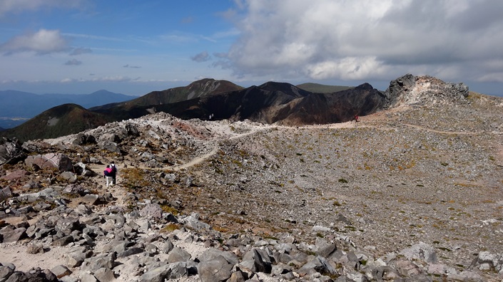 2014年09月23日(祭・火)2回 女性コンビと2山巡@那須岳 仲間の山ガール二人と、東北の百名山二山を登りに行った。去年の「磐梯山」「吾妻山」に続いて、今回は「那須岳」と「安達太良山」だ。まず「那須岳」へ。早朝4.00時にN女史とS女史を乗せて、高速道路をひた走る。北陸道から磐越道に入り、東北道で東京の方へ少し戻り、白河インターで降りて那須ロープウェーの山麓駅を目指す。11.00時過ぎに山麓駅に着いたが、周辺の駐車場は満車で入れない。駐車場へ入ろうと車が数珠つなぎで待って居る。先へ進むよう指示されて、さらに登ると峠の茶屋のある広い駐車場に着いた。しかしこの駐車場も満車。一方通行で戻る林道にも車があふれている。我々もその林道に、ようやく一台無理やりに入り込む。 ![]() 11.15分に車を停めて、峠の茶屋より、遊歩道をロープ―ウェー山麓駅に降りる。一周してここに下山の予定なので、歩く距離には変わりない。 ![]() 11.35分にロープウェー山麓駅に着いた。20分間隔で運行されており、11.40分にすぐ乗れた。大きなロープウェーで大勢乗れる。 11.50分、歩き出す。麓が見える。 ![]() 頂上も見える。ロープウェーを降りてから頂上まで、木が生えていない。 ![]() 振り返る。ここら辺りから、溶岩がゴロゴロの道になる。少し右側を捲いてゆく。 ![]() 茶臼岳の旧噴火口のふちに登り着き、火口をめぐる道を、時計の針の周る方向に歩き出す。直ぐ那須三角点の標識があり、5年前に見逃した4等三角点が在った。5年前は霧で頂上付近の様子が全然判らなかったが、こんなに展望の良い山だったのだ。三角点名は「那須岳」で4等、しかし傾いたかして、現在処置保留との事である。12.35分。 ![]() 前方に鳥居が見えてきた。あそこが頂上らしい。秋の雲が素敵だ。 ![]() 鳥居をくぐって頂上到着。12.45分。那須岳神社の石の祠がある。 ![]() なだらかな頂上で、360度の展望。思い思いに陣取り昼食中。我々も昼食。 ![]() 下に広がる大きな平原の、紅葉が綺麗だ。日の出平かな?。 ![]() これから降りてゆく方面には、尖った朝日岳、遠いのは三本槍岳らしい。 ![]() 13.30分に下山開始。火口のふちを歩いてゆく。 ![]() 頂上の下の、水蒸気の出ている噴口が見える。牛ヶ首と云う地点の近くらしい。休憩広場が見える。 ![]() 前方の峠に避難小屋が見えてきた。右の尖った朝日岳。奥の三本槍岳。 ![]() 那須岳は火山の山だ。 ![]() ![]() 牛ヶ首からの道が合流してくる。 ![]() 14.20分に避難小屋に到着。茶臼岳を振り返る。 ![]() 茶臼岳の裾を捲いた道を降りる。今日は天気が良く、那須平野が望める。 ![]() 右手の朝日岳を見ながら降りる。 ![]() ![]() 「エゾリンドウ」が多く咲いている。立札があり、エゾリンドウは北海道だけではなく、那須辺りまで分布しているようだ。 ![]() 15.15分に、峠の茶屋のある駐車場に到着。車はほとんどなくなっている。 ![]() 那須高原を降り、白河インターより高速に乗り、郡山インターで降り、インター近くの、予約してあったビジネスホテルに泊まる。早朝よりの運転で、すぐ那須岳に登り、ホテルに着いたのは17.00時。風呂に入りホテルでの夕食に、飲めないビールを飲んでパタンキュー。明日は「安達太良山」を目指す。 ●次項2014年・第65回登山は、9/24福島県「安達太良山」へ● |