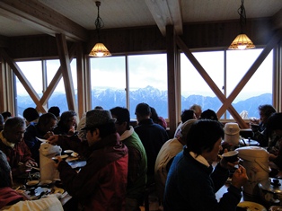 2011年10月4日-5日(火水)2回 「唐松岳」 往復 「一日目。10月4日(火)リフト終点より頂上」 去年、初めて「唐松岳」に登った。今年は夏に登り損ねた。今回が、今年最後の北アルプスになるだろう。S女史を唐松岳に案内する事になった 小松の自宅を5.30分に出て、糸魚川から国道148号線を走り、白馬村に近ずくと「白馬大橋」を渡る。車を止めて橋の上から写真を撮る。実に綺麗に見える。真ん中の白馬三山と、右が小蓮華山、左が天狗尾根。8.40分。 ![]() お天気が良くて、八方尾根のゴンドラ駐車場は、満杯である。ゴンドラとリフトを2本乗り継ぎ、1800mの地点より歩き出す。9.30分。東の方面は「岩岳」の上に、左より「雨飾山」「焼山」「火打山」らしい。 ![]() 八方尾根の左方面は「五龍岳」と「鹿島槍ヶ岳」だ。上は雪、ここは紅葉している。 ![]() 前方に「八方池」が見えてきた。八方尾根の上より、ちょっと下がった稜線の小さなピークが「唐松岳」である。続くは「不帰の嶮」 ![]() 10.50分。八方池到着。残念ながら「白馬岳」に雲が掛かってしまった。 ![]() 「天狗尾根・天狗ノ頭」は新雪に覆われ、数年前歩いたスイスアルプスを彷彿させる。 ![]() 池を過ぎると、一度ダケカンバの林を通る。11.55分。 ![]() 12.40分、「白馬鑓ヶ岳」の雲が晴れてきた。 ![]() 13.05分。今日はついている。ますます天気が良い。 ![]() 八方尾根を登っていても、その頂上の唐松岳がなかなか見えない。13.15分、真ん中の三角形の山が「唐松岳」だとようやく気付いた。登山路が左の山の斜面を横切っている。この山の方が高く見える。 ![]() 少し登山路に雪が残っている。ここ二・三日の雪らしい。頂上近くの、斜面のガレ場は、雪で滑りそうで怖い。14.00分、小屋到着。今回の私の付き添い人、S女史。 ![]() 小屋の受付を済ませ、荷物を置いて、頂上を目指す。頂上は目の前、人が居るのが見える。登山路に雪がある。14.25分。 ![]() 北の方面には、「不帰ノ嶮」「天狗尾根・天狗ノ頭」「白馬鑓ヶ岳」。鑓ヶ岳は真白である。杓子岳と白馬岳は、鑓ヶ岳に隠れている。 ![]() 南の方面には、「五龍岳」。鹿島槍ヶ岳は五龍岳に隠れて見えない。五龍は圧倒的な威圧感がある。新雪が積もって、我々には登るのは怖そうで無理だな。 ![]() 西の方面には、遠くは「薬師岳」。「立山」の雄山、大汝、真砂、別山と、「剣岳」 ![]() 東の方面は、今日泊まる唐松小屋が見え、下界がまだ晴れて見える。向こうは八ヶ岳だと思うが・・・。写真から外れるが、「妙高山」「黒姫山」「乙妻山・高妻山」「戸隠山」「飯綱山」は少し雲が出てきた。 ![]() 14.55分、頂上。寒い寒い。耳が冷たくて我慢が出来ないと、S女史は先に降りて行った。槍・穂高も富士山も見える。5.6人いた登山者も全員降りて行って、私一人きりになった。こんな機会は滅多に無いと、寒さを我慢して一人で、四方を眺めて山にふけっていたが、さすがに寒くなって降りる事にした。 ![]() 小屋に着く頃4人ほど登って行った。17.00分に食堂で食事。全員集まっても30人位だ。食事がすんで、17.40分頃、日本海に夕日が沈んでいった。山の間に富山県の平野が見え、暗くなったら地上の明かりが見えた。明日は昼ごろより雨の予報だ。 ![]() 「二日目。10月5日(水)唐松小屋より下山」 少し曇っているので、まさか日の出は見えないだろうと思って、外へ出なかったら、日の出が見えたという。あわてて小屋の裏へ回ったら、雲の間に太陽が見えた。5.55分。つっかけで外へ出ても、この小屋は日の出が拝めるのだ。 ![]() 6.25分、剣と立山に朝の光が射してきた。また写真を撮りに外へ出る。 ![]() ![]() 6.30分朝食。食堂は、窓の目の前に剣岳が見える。 ![]() 7.10分、下山開始。ガレ場は左が切れ落ちていて怖い。ロープにつかまって慎重に降りる。残っている雪が凍っている。 ![]() 雷鳥を発見。お腹の方が白くなってきた。 8.10分。丸山ケルンに到着。北信五山方面が見える。「妙高・黒姫・飯綱・戸隠・斑尾」を差すらしい。その右は頸城アルプス。「妙高・焼山・火打・高妻・乙妻」あたりを云うらしい。見分けの付く山もあるし、不明の山もある。 ![]() 山の方から段々曇ってきた。真っ赤なナナカマドがあり、向こうに真っ白な五龍岳。 ![]() 9.40分、八方池まで下りてきたら、小雨がパラパラと来た。白馬方面の山は雲が掛かってしまった。 ![]() 昨日は人でいっぱいだったのに、さすが今日は人が居ない。合羽を着る。 ![]() 池の周りを回って下山する。小屋泊まりで荷物がいつもより多かったので、少し腰を痛めた。まっすぐ立つと後ろにひっくり返りそう。S女史が心配して、後ろから支えてくれながら、よろよろとようやく11.30分にリフト駅に到着。 ![]() 白馬八方温泉に入りに行ったら、水曜は休み。他に入浴できそうな所を探したが見つからない。ならば去年と同じ「道の駅・小谷」の「深山の湯」に入ろうと思ったら、なんとここも休み。どうしても温泉に入りたいから、少し戻って「小谷温泉郷」