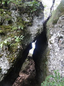 2017年05月24日(水)4回 松尾寺コース「青葉山」 S女史と「青葉山」へ登る事になった。彼女は初登山で、前々から登りたいと言っていた。私は6年ぶりの三度目である。前回までは「中山口」から登った。東峰に登り着き、そこから西峰に至るまでが、大岩ゴロゴロの危ない道だった。梯子が連続、蟹の横這いみたいな岸壁の鎖場もあった。この年ではチョット危なっかしいし自信もない。だから今回は「松尾口」から直接、西峰に登るコースを選んだ。初めてのコースである。登り口の「松尾寺」は、西国33か所の観音霊場なので、掛け軸に御朱印を貰いに訪れた記憶がある。 ![]() 7時に「加賀ゆめのゆ」で待ち合わせ、加賀ICより高速に乗り、小浜西ICで降りて国道27号を走る。舞鶴若狭自動車道が出来て、少し早く着くようになった。高浜辺りから前方に青葉山が見えてくる。まさに「若狭富士」である。国道の県境を越えるトンネルを抜けて京都府舞鶴市に入ると、すぐ右に松尾寺への林道が分岐している。 ![]() 標識を右に入り、狭い道を登って行くと、松尾寺の門前近くの第一駐車場に到着。後の駐車場は、この上を鋭角に右に登って行く様だ。平日なので空いているのでここに留める。駐車料金400円は本堂で納めるようだ。靴を履いてリュックを被いて正門の石段を登る。9.25分。 御本尊馬頭観世音の石碑の建つ、仁王門をくぐる。 ![]() ![]() 雰囲気の良いお寺である。石段の上に本堂が見える。 ![]() ![]() 本堂にお参りして、駐車料金も納める。 本堂右側に、本堂に続く渡り廊下がある。その下を抜けると登山口がある。案内板がある。 初めは緩やかで、すぐ林道を横切って進んでゆく。 ![]() ![]() 緩やかな部分を過ぎて、京都福井の県境の急斜面を登り出す。地理院地図には、ギザギザの登山路が記入されている。階段でも切ってあるのかと思っていたが、特に階段は無し。しかしロープの下がった所が、次々と現れる。地図を見ると、300m程の標高差を一気に登る。なかなか辛い。 見通しは利かず、ブナの木の混じった林を登る。紅葉の木が多い。秋は紅葉が奇麗だろう。 ![]() ![]() 11.15分、長い梯子が懸かった大岩を登る。 今日は段々と天気が悪くなる予報。先ごろポツポツと降りにかかったので、彼女はリュックカバーを付けた。 登り口近くで、早くも下山してきた男に遇ったが、それ以外登山者は居なかった。 ![]() 突然に急坂が終わり、頂上の一角に登り着く。目の前の岩の上に祠がある様だ。地理院地図に鳥居マークがある地点だろう。石灯篭もある。疲れていたので登らなかった。ここから、692mの記入のある「西峰」までは緩やかに登り下り。途中に「今寺口」に降りる登山路が分岐している。帰りはここを降りる予定。この辺りで若狭湾の方がちらりと見える。 ![]() ![]() ![]() マムシグサ ハナイカダ ツクバネソウ 11.55分に西峰の祠に到着。2時間以上も掛かっちゃった。 ![]() ![]() 祠の右に休憩所がある。全体が板張りで、登山の避難小屋みたいな感じである。リュックを置いて祠の後ろの岩山に登る事にした。 まず、祠の前の登って来た方面を振り返る。向かい側の山に、去年登った「三国岳」があるはずだがどれかな? ![]() 祠の後ろの、岩山に登る。ロープが下がっており、よじ登ると、細い柵付きの道。岩に黄色い花がぎっしりと咲く。 ![]() 若狭湾の「内浦湾」が覗ける。右下の、木の陰になっている所に「高浜原子発電所」がある。 ![]() 天気が悪いので、景色が見えるか心配だったが、何とか見える。 ![]() 雲が出てきた。降るかもしれないな。 ![]() ![]() ![]() ![]() 記念撮影 タイトゴメ ホウの花 ![]() この黄色い花は、福井の山で見かけたことがある。名前が出てこなかった。家へ帰って調べたら「浄法寺山」で見かけた「タイトゴメ」だった。岩の間に咲く花のようだ。 ![]() 祠の前の隅に、ロープで囲んで「オオキンレイカ」の苗が植えてある。立て札によれば「オオキンレイカ」は、青葉山だけに自生する黄色いオミナエシらしい。絶滅が心配されて、地元高浜町の小中学生が、苗を育てて植えているらしい。「オオキンレイカ」の苗を見守ってください、と書いてある。 ポツリときたので、小屋に入って昼食。12.40分頃下山開始。大きなブナの木がある。分岐を「今寺口」の方へ降り始める。此処もすごい急坂に変わりはない。しかし登って来た道より、急坂はちょっと短いし、勾配も緩やかに感じる。 ![]() ![]() ![]() ![]() 荒れた林道を渡った先で、林道終点に出る道と、旧道の分岐に出た。今回は遠回りになるが、坂を降りるのが嫌なので、林道の方へ降りた。13.50分に、この案内板の建つ林道終点の駐車場に出た。ここまで舗装道路が登ってきている。ここからは舗装された林道を歩く。 ![]() ![]() ![]() ![]() フタリシズカ アザミ エゴノキ ![]() 林道からは、先ほどまで居た「西峰」が見える。右が「東峰」で、西より1m高い。 ![]() 14.23分に今寺に到着。六地蔵がある。ここから車道を、松尾寺へ戻る。 ![]() 14.40