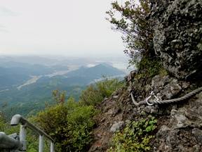 2010年09月19日(日)初登山 中山寺コース「青葉山」 「青葉山」は一度登りたいと思っていた。謡曲の「氷室」の中にこの青葉山が出てくる。「我この度丹後の国、九世の戸に参り。既に下向道なりば。これより若狭路にかかり。津田の入江、青葉、後瀬の山々をも、一見し。それより都に帰らばやと存じ候」。 ただこれだけであるが、能楽師の端くれとして、ちょっと登っておきたい。場所は知っていた。西国33箇所観音霊場の札所「松尾寺」が中腹にある。本尊は珍しい馬頭観音で、お札を頂きに行ったことがある。 ![]() 自宅を6.00に出て、北陸道を敦賀市で降り、国道27号線をひたすら走る。小浜市を過ぎて若狭湾に面して進む。高浜の町に入ると、正面に青葉山が見えてくる。町を通り抜けて、日置という信号を右折して山へ向かう。「中山寺」「青葉山青少年旅行村」方面と書いてある。中山寺の前を通り、9.20.旅行村の広い駐車場に車を入れる。家を出て3時間20分掛かっている。隣県なのに滅茶苦茶遠かった。 ![]() 駐車場に車を置いて、登ってきた舗装道をそのまま300mほど進むと、右に標識があり登山路がある。案内図によれば「中山登山道」「高野登山道」「今寺登山道」「松尾登山道」と4本あり、ここは中山登山道である。9.30.歩き出す。 ![]() 初めは竹林だが、すぐ手入れのされた杉林になる。道も良く手入れされている。 ![]() 9.50.左から高野登山路が合流してくる。 ![]() 10.15.テレビ中継所アンテナかに突き当たる。下まで登ってみたら海が見えた。 ![]() さらに15分登ったら、木造の展望台があった。登ってみると高浜の町が見える。 ![]() 10.40.広場に着いた。ベンチがある。頂上かと思ったら「青葉神社」でなくて「金毘羅大権現」らしい。 ![]() 尾根の先に大きな岩の上を通るところがある。左が絶壁で下の町が箱庭のように見える。少し怖い。ここが「馬の背」だろう。危ないので手前から右へ捲き道もある。 ![]() 11.25.頂上の「青葉神社」に着いた。「青葉山東の峰山頂」の標識がある。ここが最高峰だが、林の中で展望は無し。社殿も粗末である。ブナも混じる林である。しばらく休んで西の峰を目指す。 ![]() しばらく歩くと途端に様相が違ってくる。東の峰と西の峰をつなぐ吊尾根は、岩ゴロゴロのスリル満点の道となる。カニの横這いのように岸壁をロープに繋がって渡る。すこし足がすくむ。舞鶴の町が見える。 ![]() 鉄の梯子が幾つも続く所もある。慎重に進む。このコースはあまり登る人がいないようだ。人に会わない。 ![]() 向こうに西の峰が見えてくる。東より1mほど低いはずだが、そびえている。 ![]() 大きな岩の裂け目の間を通る。泰澄大師が修業した大師堂らしい。急坂を登り切ると神社に出た。12.10. ![]() この神社は「松尾寺」の奥ノ院らしい。横に大きな休憩所がある。登山者が何人も休んでいる。松尾寺から登ってくる人が多いようだ。 ![]() 神社の後ろに、大きな岩山が聳えている。休憩所に荷物を置いて登ってみる。ロープが下がっている。 岩の上は狭く海側は切れ落ちている。覗くとまことに怖いが、素晴らしい景色が広がっている。こちらが北の方面だ。 ![]() 南の方面は平野の向こうに、舞鶴若狭自動車道が見える。山並みが続くが名前は知らない。 ![]() ![]() ![]() 地図と見比べると、若狭湾の中の「内浦湾」で、高浜原子力発電所も右の山陰にあるようだ。 ![]() 昼食を済ませて12.30.下山開始。登ってきた道を慎重に戻る。青葉山は双耳峰だとは知らなかった。富士山のように尖っているとばかり思い込んでいた。見る方面で全然形が違っているようだ。青葉神社のある峰は、ブナの木が多い。気持ちの良いブナ林が、杉の林になり、竹林に入ると登山口に着く。 途中、高浜の道の駅に立ち寄り風呂があったので、汗を流して帰る。ここから小松まで、やはり3時間以上かかる。 |
