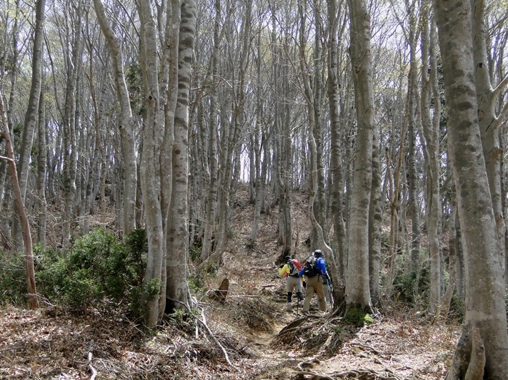 2016年04月10日(日)2回 昨日から大阪のN女史が北陸へ来ている。彼女が言うには、北陸の山は良いという。里山らしくて良いという。昨日は予定が合わなくて、我々は「ホノケ山」、N女史はN氏と「権現山」だったらしい。今日は一緒に登りましょうと呼びかけてもらって、「野坂岳」に登る事になった。5年ぶりである。N氏の車は4人。私の車に相棒K君、N女史の車と2台で加賀ゆめのゆを7.30分に出発。前回と同じキャンプ場で待ち合わせだ。野坂いこいの森を抜けキャンプ場も抜けると駐車場がある。車は満杯、桜は満開。9.20分に到着。すぐN氏の車も到着。9.30分に谷沿いの登山路を登り出す。 ![]() 谷沿いの道を登り、10.10分に桜の木がある地点で川を渡り、尾根へ取り付く。敦賀湾が望める。 ![]() ![]() 11.00時頃、「行者岩」への分岐に出る。相棒が行者岩の方から戻ってきて、先へ進みだした。元気の良い男だ。私は、荷物を置いての往復にも、へたばりそうでパスをしている。少し登ると行者岩が見える。岩の上まで急坂があるようだ。見晴らしは良さそうだな。 ![]() ![]() 11.15分に「一の岳」の標識に出る。見晴らしが良い。ここは頂上ではないので「一の岳展望台」が妥当だろう。地蔵様が石の祠の中で手を合わせている。 ここから、一の岳頂上は通らずに、尾根の鞍部に登り着く。尾根まで登りきり振り返ると、大きいピークが一の岳だろう。ここからは緩やかな尾根歩きとなる。 ![]() ![]() 11.55分に「二の岳」の標識に出る。ブナの林が続く。 12.10分に「三の岳」の標識に出る。ようやく向こうに頂上が見えてくる。もう何人も下山していった。 ![]() ![]() ![]() 12.20分に、頂上の避難小屋に出る。大きな奇麗な小屋だが、お天気が良いので誰も入っていない。 ![]() 頂上三角点は「一等三角点」で大きくて立派である。 一段下で、皆さまお待ちかねで食事中。遅れまして申し訳ありません。大きなおにぎりを二個頂いて、自分が持ってきた菓子パンは非常食に回しました。М女史様ありがとうございました。 ![]() 遠くに薄く見えるのは「青葉山」らしい。 ![]() ![]() 12.50分頃下山開始。ブナ林で相棒が見付けたのは、つぼみのカタクリでした。 ![]() ![]() ![]() 見かけた花 ![]() ![]() ![]() カタバミ ツバキ イワウチワ ![]() ![]() ![]() ショウジョウバカマ カタクリ 水場の橡木地蔵14.20 ![]() ![]() 15.00時に車に到着。足が遅いので、頂上でみんなと別れの挨拶をした。皆さまはもうとっくにお風呂へ行ったようだ。 エンゴサク イカリソウ 昨日に続き今年2度目の相棒との山行き。二人で山談義をしていたらあっという間に、ゆめのゆの駐車場に着いた。 ★次項2016年の第31回登山は、4/12「熊坂妙高山」へ★ 2011年05月05日(祝)初登山 敦賀の「野坂岳」へ登りに行く。敦賀に私のお稽古場があり、月一回だが長い間敦賀に通ったから、どの山か見当がついていた。敦賀の町は海の近くにありながら、周りを山に囲まれた盆地みたいな感じである。御稽古場は生徒の老齢化が進み、去年閉鎖になってしまった。 ![]() 8時に「加賀ゆめのゆ」の駐車場で待ち合わせ。今日はSN女性コンビとN氏の4人。私の車に乗り換えて出発。高速を敦賀インターで降り、国道8号線を小浜の方へ走り、国道27号線を敦賀市の真ん中の高架で降り、柴田氏庭園の前を通り、小浜線粟野駅の高架を潜り抜けて、野坂いこいの森に向かう。山道をしばらく登ると少年自然の家があり、さらに登るとキャンプ場がある。駐車場があり車が何台も留まっている。山に向かって広い遊歩道があり、「野坂山登山口」の標識がある。頂上まで2時間30分と書いてある。 ![]() 地理院地図では「野坂岳」となっているが、地元では「野坂山」と云うらしい。9.30分歩き出す。イカリソウがいっぱい咲いているが、全部紫色である。白いのに見慣れているので大変美しい。イカリソウは白いものだと思っていたが、関西方面では白は珍しいらしい。加賀の里山には白色の物しかない。 ![]() 川筋を登ってきたが、10.05分に川を渡り斜面に取り着く。渡渉地点が最後の水場らしい。トチの木地蔵の標識がある。地蔵を彫った石が二つほどある。 ![]() 少し登ったら敦賀の町が見えてきた。野坂岳は「敦賀富士」とも呼ばれるらしい。富士と呼ばれる山は、急坂が続きほとんど登り一方である。この山も急坂が続き辛い山だ。だいぶ皆から遅れてしまった。 ![]() 右手の上の方に「行者岩」が見えてきた。近ずいてきたらパーティの3人が大岩の上に見えた。アップで撮った。 ![]() 10.40分、行者岩への分岐に着いた。荷物を置いて登りに行っているが、ここから見ると結構遠い。人が小さく見える。これ以上の遅れると迷惑がかかるので、登るのはあきらめた。展望は良さそうだが。 ![]() 分岐よりしばらく登ったら広場があったので、コーヒーを点てて貰って休憩タイム。11.15分「一の岳」の標識に出た。敦賀の市街が俯瞰できる。どうやら稜線に出たようだ。続いて「二の岳」。急勾配が無くなり縦走みたいな感じになっ