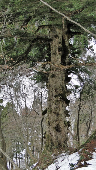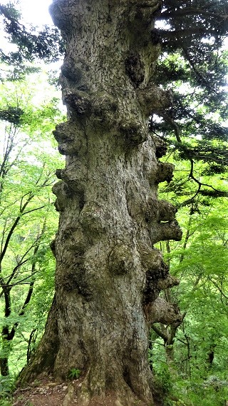 2021年12月05日(日)4回 裏参道-「権現山」を往復 2年振りに「権現山」に登った。今年中に大坂のN女史がもう一度、一緒に登ろうというので、少しでも大坂に近い福井の山になった。鯖江インター近くのコンビニで待ち合わせ。車二台で越前市柳元町を目指す。ナビ頼りで柳元町の細い道を抜けて駐車場到着。9.40分。 ![]() トイレがあり先着の車4台。今日は裏参道の瀧めぐりコースを登る予定。「柳の滝登り口」の標識を入る。柳の滝とは「不動滝」「お釜滝」「布滝」「窓滝」「夫婦滝」の五滝である。 ![]() 柳の滝とは、柳元町の滝、という意味だな。 ![]() 100m歩くとすぐ「不動滝」に着く。滝の横の岩壁に「不動の摩崖仏があるらしい。」 しばらく見ない間に苔むしたな。大きい座像は「泰澄大師」。その右の丸い埋め込みに小さい窓、この中に摩崖仏があるらしい。確認できない。その右に「小六」と彫ってある。小六とは剣豪「佐々木小次郎」の幼名で、この近くの「高善寺」で生まれた小次郎は、この滝で剣術の稽古をした。 ![]() ![]() 階段を登って行くと「お釜滝」に出る。滝壺がお釜のように見える。横の階段を登って行く。上から見るとお釜は何段にもなっている。 ![]() ![]() 続いて「布滝」が見えてくる。白布を掛けたように流れ落ちている。音も静かである。 ![]() ハイキングコースは「中部北陸自然歩道」になっている。 ![]() ![]() しばらくは川に沿って緩やかに登って行く。この滝には名前が無い。 ![]() 最近天気が悪かったので水量が多い。二人組が追い越して行った。私の仲間3人にもだいぶ遅れたようだな。 ![]() 砂防ダムの滝。 ![]() 「窓滝」が見えてきた。稜線の窓から二筋になって落ちている。 ![]() 川を渡った向かい側に「こもり岩」がある。平家の落ち武者が籠っていた。 ![]() ![]() ここから右の斜面の、杉林の急坂を登り出す。別の谷川に「夫婦滝」があった。二本になって落ちるので夫婦滝なのだが、今日は水量が多くて一本に見える。 ![]() ![]() 急坂が続いてヘタバッタ頃に、ようやく尾根の上の「松ヶ嶽神社の大モミ」に登り着く。越前市指定天然記念物で根回り8m。鷹さ30m。 ![]() 女性5人くらいのパーティーが降りてきた。滑るから気を付けてと励まされる。 ![]() 細い尾根である。もう頂上は近いはずと思っていたら、S女史が迎えに来た。頂上を通り越した避難小屋で、「鍋パーティー」の準備中との事。私の軽いリュックを担いで行ってしまった。ありがとう。裏参道であるから、松ヶ岳権現神社の裏に登り着く。 ![]() 松ヶ嶽権現神社の建つ権現山頂上到着。木が茂って前よりも展望が悪くなった。標高565m。 ![]() 追い抜いて行った二人組が食事中。神社は雨乞の神として信仰を集めている。 ![]() 「日野山」が見える。その左に顔を出しているのが「ホノケ山」らしい。 ![]() 少し下がった鞍部に「避難小屋」がある。 ![]() 12.25分。お待たせしました。いつも鍋が出来上がった頃に到着する老人です。温かくて腹にしみいる。いつもありがとう御座います。今日は4人パーティ。 ![]() 食事を済ませて、荷物を置いたまま展望台へ。少し上ると「三峰神社」の祠。何かを見付けたらしい。 ![]() 「ツチグリ」というキノコでした。 ![]() 斜面を登り、作業道を横切って更に登ると展望台に着く。「鞍が上」展望所と言うらしい。620m位の標高。 ![]() あんまり展望が無くて残念な展望台。 ![]() 「官行造林記念」の石碑だけがある。 ![]() 下山開始。表参道の降り口。今回はここを降りずに登って来た道を降りる事になった。皆様は表参道の急坂に懲りた経験がある様だ。 ![]() 大坂組の二人と、もう今年は一緒に登れるか判らないね、と手を振って別れた。駐車場の最後の一台となった。 ■次回登山は、12/11小矢部の「矢部山」へ■ 2019年05月18日(土)3回 表参道-「権現山」-裏参道 ![]() 7年ぶりの「権現山」である。加賀ゆめのゆでK君とS女史を乗せ、高速鯖江ICで降り、越前市柳元町を目指す。車のナビ頼りで、すんなりと到着。一番深い所で、その先には集落が無いようだ。町に到着すると案内があり、町の細い道の突き当りの奥の駐車場に到着。9.00時。 ![]() 今までは、裏参道の滝コースを登って居るが、今回は表参道を登る予定。歳をとると急坂を降りるのが怖くなる。躓いて転げ落ち怪我をするのが怖い。だから今回は表参道の急坂を登る予定。駐車場から滝コースへ進む表示があるが、表参道への表示が無い。林道を少し登って行くと、林道は左に曲がって行くが、右に少し下がった地点に山に入る登山口がある。ここから登る人が少ないのか、この分岐には標識無し。 急坂を登り、9.50分、少しなだらかになった地点で抹茶休憩。大きなブナの木の下、誰も登ってこないから、登山路の真ん中に陣取る。暑い日なのでガラス容器の茶碗で冷水仕立ての抹茶である。優雅でしょう。でしょう。K宗匠ありがとうございます。 ![]() ![]() ![]() ![]() 頂上に近ずくとまた急坂が続く。大きな二股の杉の木がある。ここまで