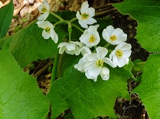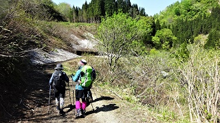 2018年05月05日(祝)4回 平-朴峠経由で「高落場山」往復 「高落場山」は一度だけ登った事がある。縄ヶ池の方から唐木峠経由で登った。去年と一昨年、五箇山の平のスキー場から「高坪山」に登った時、道宗道の朴峠経由の高落場山が目の前にそびえていた。一度こちらから高落場山に登りたいと考えてきた。連休である。小松市民病院でS女史と待ち合わせ。一人かと思ったら大阪のN女史とМ女史も居て、熟女3人との4人パーティーとなった。高速で東海北陸道の福光インター下車。国道304号線で城端の町を抜けようと思ったが、城端曳山祭りでちょっと遠回りさせられる。五箇山トンネルを抜けてすぐ、たいらスキー場の方へ右折する。700m位で右に大きな駐車場がある。9.20分。スキー場への道は左に登って行く。 ![]() 駐車場で用意していたら男性一人の登山者に声を掛けられた。近くの小矢部市の脇坂さんだった。謡曲をなさっていて、以前メールを頂いたことがあり、道宗道の情報も頂いたことがある。謡曲の会のパーティーでお遇いしたことも一度ある。山で遇うのは初めてなので、写真を撮らせてもらった。こちらは足が遅い。またどこかでお逢いしましょう。 ![]() 9.35分駐車場の端から、林道を川の方へ降りてゆく。 ![]() 5分で「里橋」を渡る。 ![]() また5分で登山口に出る。「向かい坂」の標識がある。ここから朴峠までは「中部北陸自然歩道」と「道宗道」が重なっている。自然歩道は環境省が管理しているらしく、所々に案内看板がある。 ![]() ![]() ![]() キクザキイチゲ イワウチワ ショウジョウバカマ ![]() ![]() ![]() チゴユリ ツバキ エンレイソウ ![]() 10.30分、「立石」の看板がある休憩所で一休み。立石の大岩峰が近くにあるはずだが良く見えない。高さ27m・直径16.5mと看板に書いてある。峠越えのこの道は、昔は五箇山に入る重要な道で、牛や馬も通ったようで、特に急な坂も無く、地図を見て感じていたほどの険しさは、感じなかった。木の間から白い山が見えた。「白山」らしいぞ。 ![]() 段々と「ブナの木」が増えてきた。新緑が奇麗だ。 ![]() 今年初見の「サンカヨウ」。好きな花だ。 ![]() ![]() ![]() ![]() 11.05分に広い場所に出た。雪が残っており立て札に寄れば「お助け小屋あと」と書いてある。昔は旅人のための小屋があったらしい。それだけの難所だったのかな。 ![]() その100mほど先が「朴峠」だった。11.10分。広いなだらかな峠である。道が5本交わっている場所である。ちょっと何処へ進むかビックリする分岐である。 ![]() 登って来た道が、直進して降りてゆくのが「中部北陸自然歩道」であり、左右に、少し広い「林道」が横断している。それとは全然別に、この大きな看板の後ろに、上に登る登山路がある。これが「道宗道」である。上に登るのはこの道しかない。地理院地図には全部の道が載っているから、地図を持っていれば迷うことはない。道宗道の標識はある。 ここから「ブナ林」の中の登りとなり気持ちが良い。新緑だ。今日の3人娘。 ![]() ![]() ![]() ![]() ![]() ![]() オオカメノキ イワウチワ コブシ 12.00時に「南砺市のへそ」という地点に着いた。ドカッと開けて「白山」が中心に見える。白山の右が「笈岳」と「大笠山」らしい。下の林道は「高坪山」への林道だ。 ![]() ![]() 「南砺市のへそ(重心)」とは南砺市の面積の重心らしい。地図の看板があるが、なるほどここらあたりが重心らしい。 朝遇って写真を撮った脇坂様が、早くも高落場山頂上から降りて来ていてここにいた。見える山の説明を受け、今度は彼が我々のパーティの写真を撮ってくれた。 彼と別れてさらにブナ林を登る。 ![]() 12.30分に高落場山の頂上に到着。半分雪で覆われている。先着パーティ一組食事中。 ![]() 東の方は「金剛堂山」らしい。左のずーっと先に「立山」方面が見えるが、白く霞んでいる。 ![]() 西は「医王山」と城端の平野らしい。 ![]() ![]() 我々も食事。 ![]() 近くに大きい木が無い。隣のパーティの若い人に、山札を提げてもらう。 ![]() 隣のパーティはどうも地元の人たちらしい。 ![]() 今度は薬師岳で逢おうと、賑やかな楽しいグループは先に下山していった。 ![]() 1時間以上も長居して、記念撮影して我々も下山開始。13.35分。 14.00時ごろ、「南砺市のへそ」展望台。 ![]() 手前の丸い山が「高坪山」。後ろの右が「大滝山」。左が「人形山」 ![]() 白山の右の方面、大門とか高三郎とか奈良、見越とか・・全然判別できない。 ![]() 高落場山に、こんな素敵なブナ林があるとは知らなかった。 ![]() ![]() ![]() ![]() ![]() 朴峠のカタバミ スミレ ニシキゴロモ 14.35分 ![]() ひたすら降りてようやく駐車場は近い。 ![]() 3人とも車の側で待ちくたびれている。15.40分。 桜ヶ池クアガーデンの温泉に入って帰る。 ![]() 高落場山「YAMAP」による記録 ■活動日 2018/05/05(土) 09.33-15.35 ■活動時間 6時間2分 ?スタート9.33→(1時間28分)→朴峠11.01-11.10(9分)→ (1時間11分)→高落場山12.21-13.36(1時間15分)→(51分)→朴峠14.27-14.35(8分) →(1時間0分)→